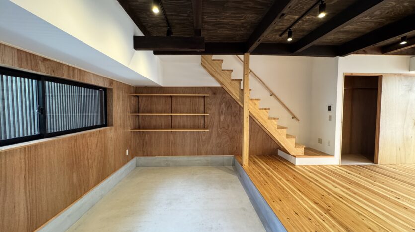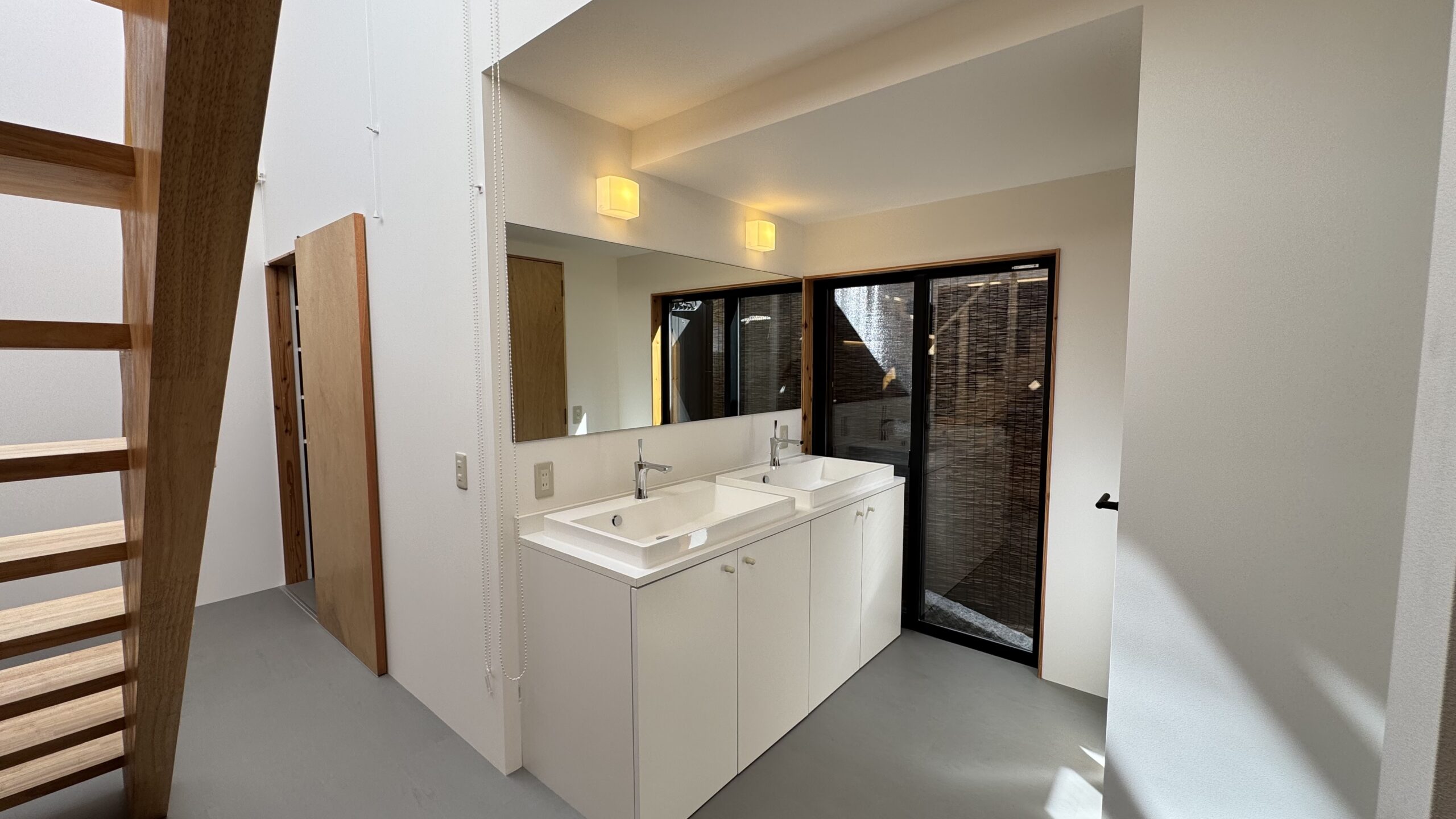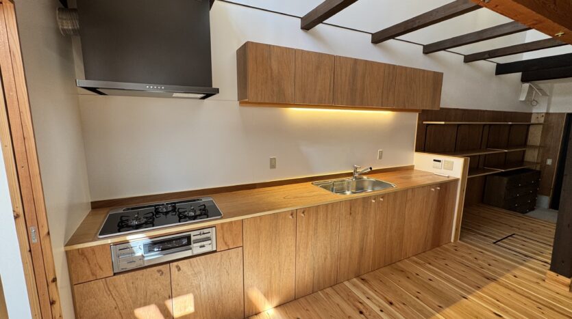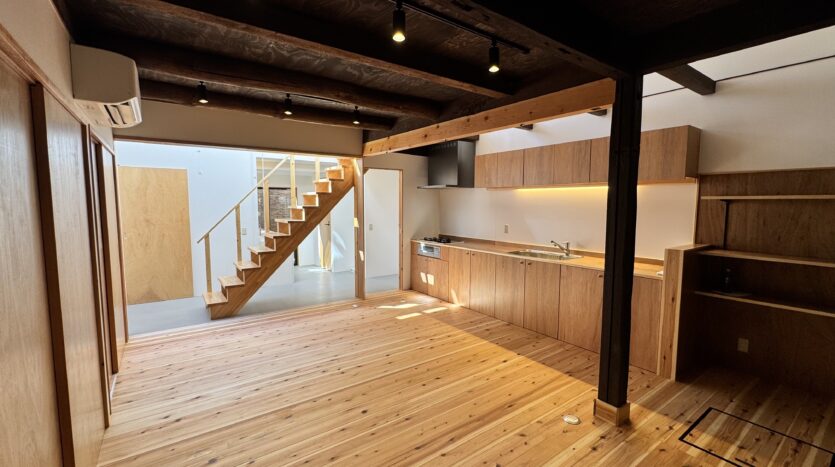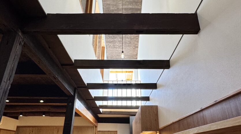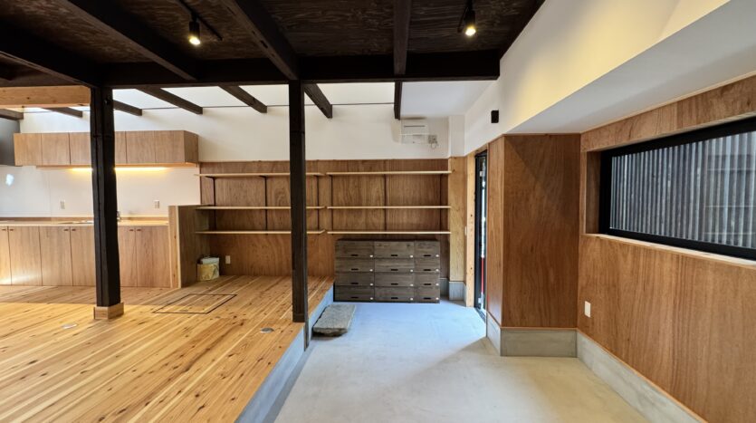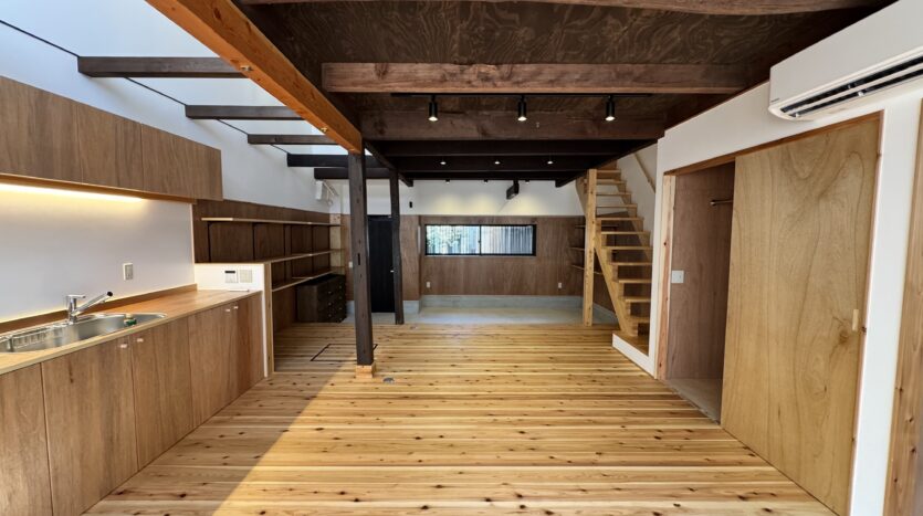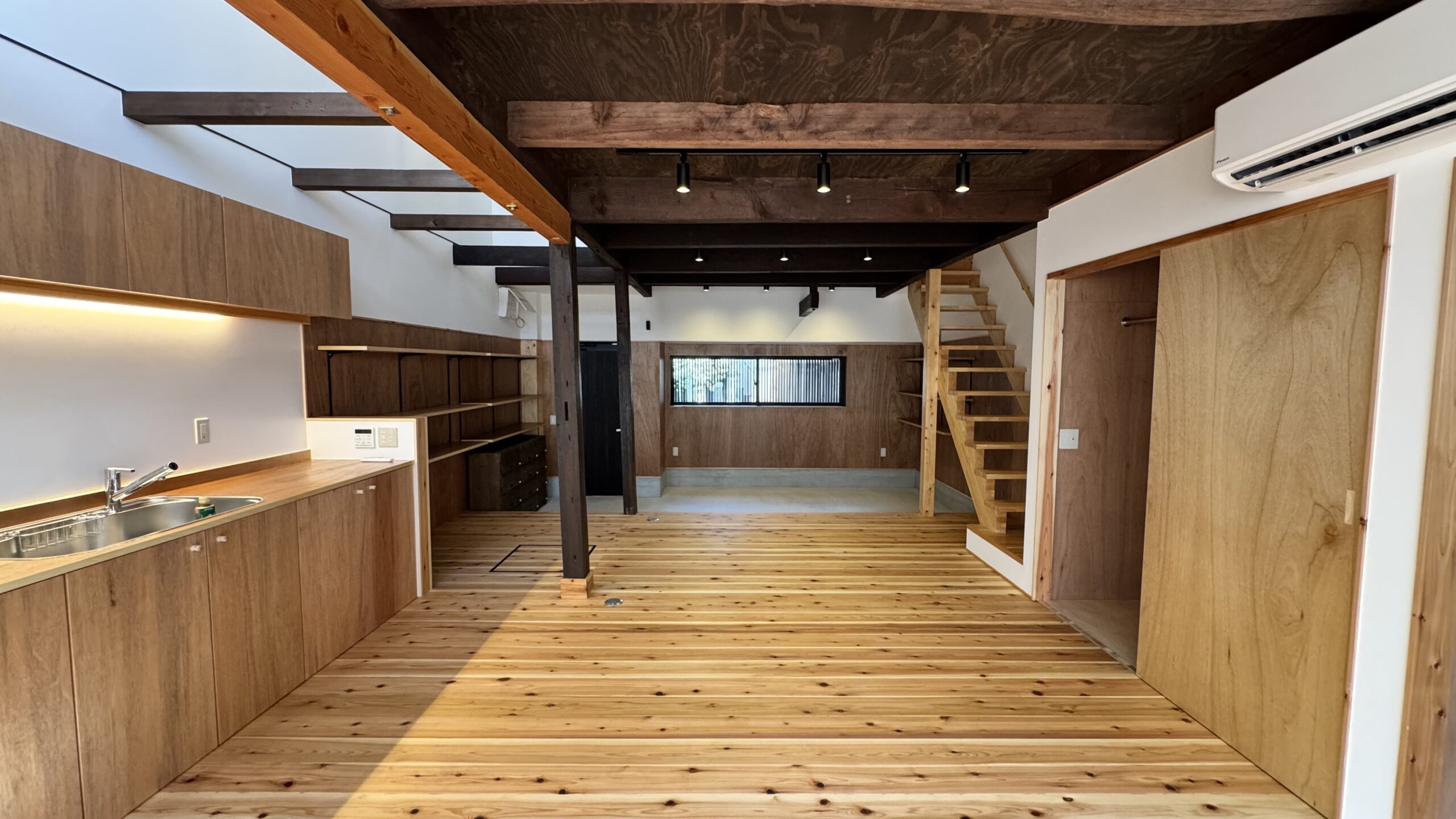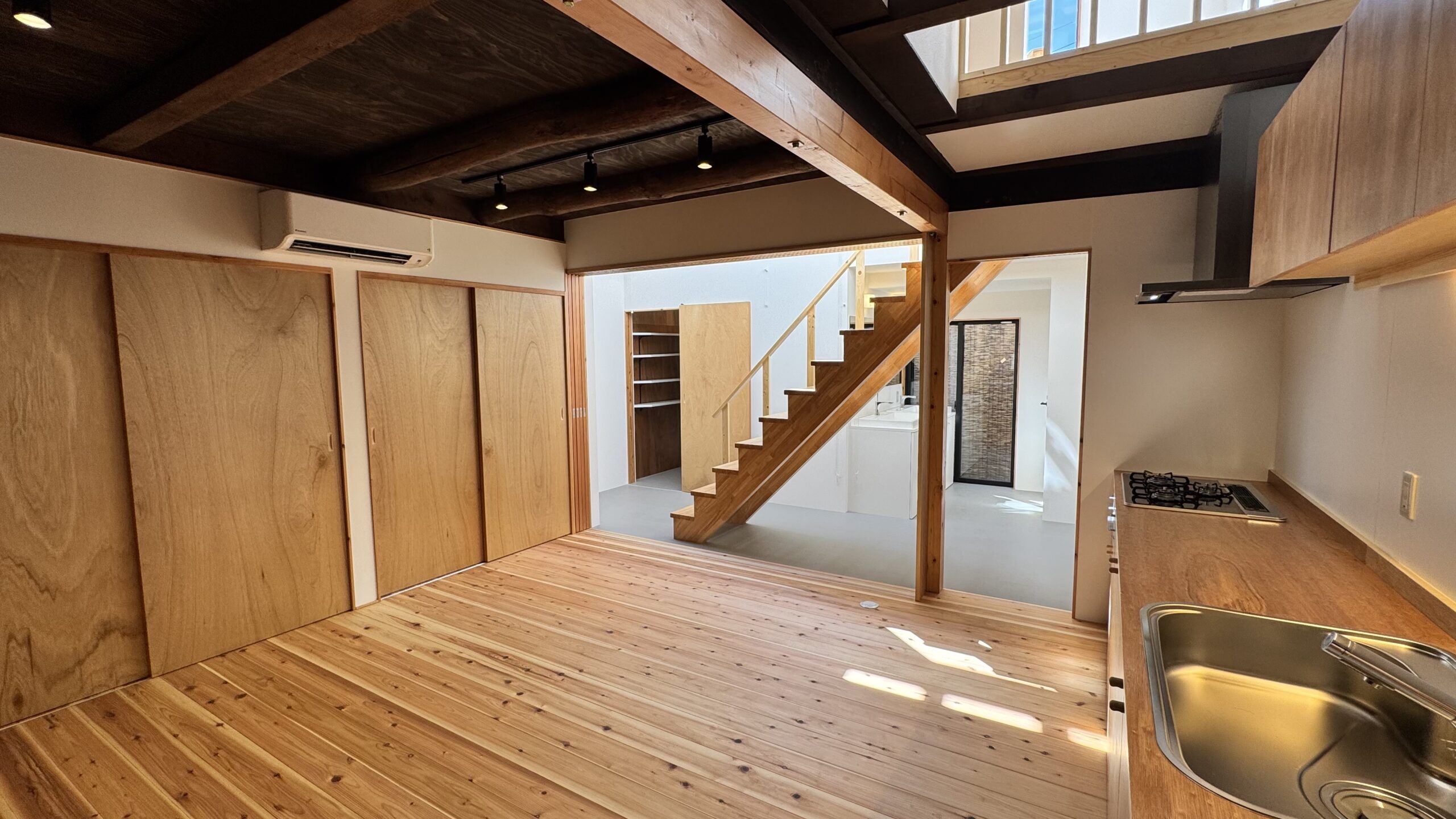 This is a machiya house located in Obagawa-cho, Otsu City, Shiga Prefecture. The building is a two-story row house, with renovations completed in September 2025. The roof tiles have been inspected for leaks, and termite inspection has been completed. Both sides of the walls and the roof are insulated, and the floors have been newly poured concrete. The water supply, sewerage, electrical wiring, and gas piping have all been newly installed. The first floor features a brand-new custom kitchen with a wide countertop that’s a must-see. There are toilets on both the first and second floors, and the first-floor washbasin has the rare feature of two sinks. The bathtub is also new and offers a view of the garden. Air conditioners are installed in each room on the second floor, and a large unit is installed in the living-dining area on the first floor. The most notable features are the second-floor double-height ceiling and the first-floor earthen floor design. The earthen floor features movable shelving, perfect for hobbies. You can park your motorcycle here upon returning home, or use it as a play area for small children. The townhouse-style double-height ceiling creates an unexpectedly spacious feel for a row house.