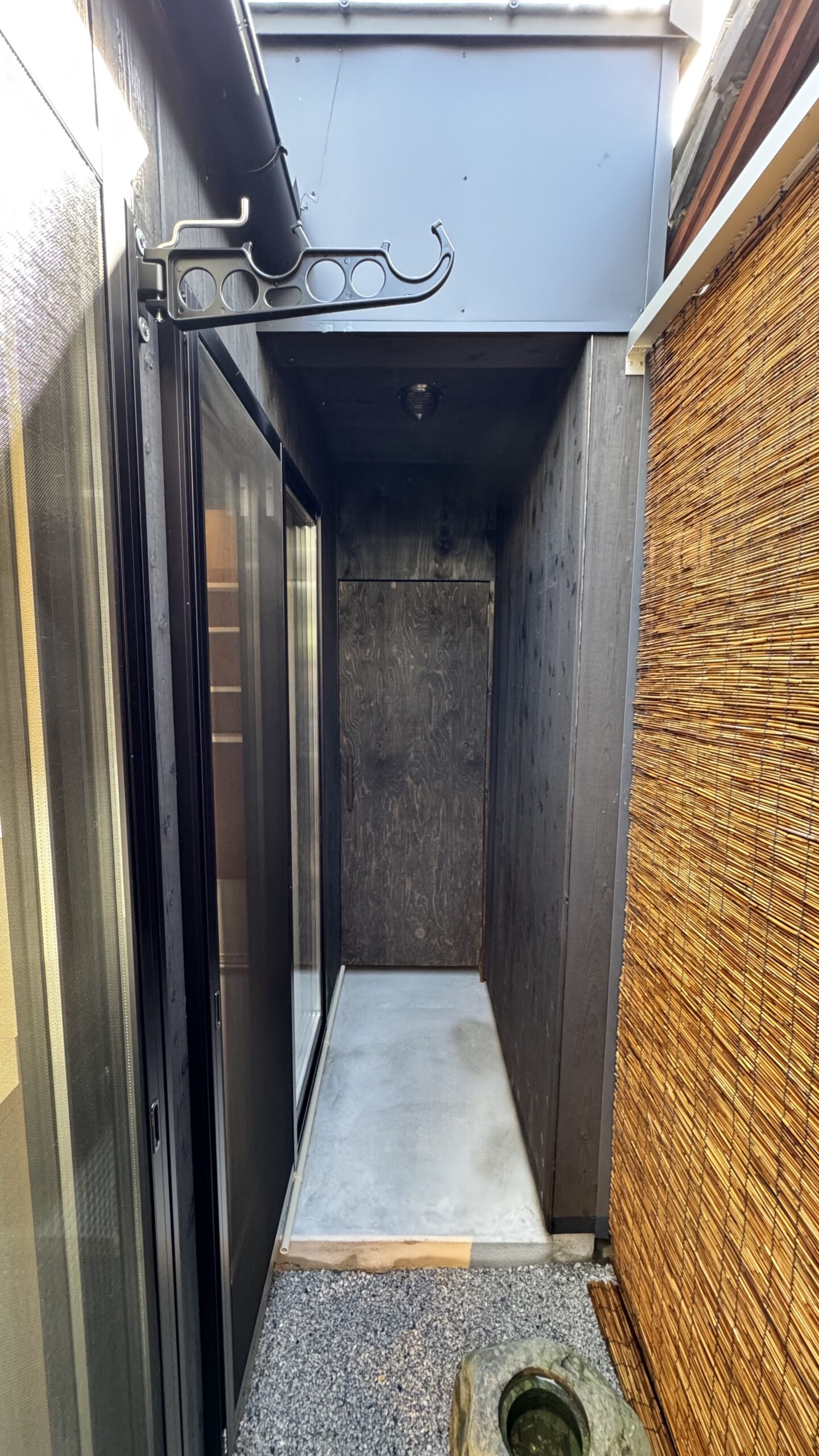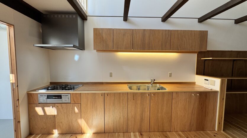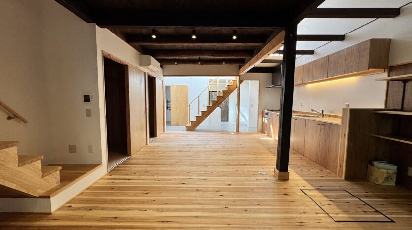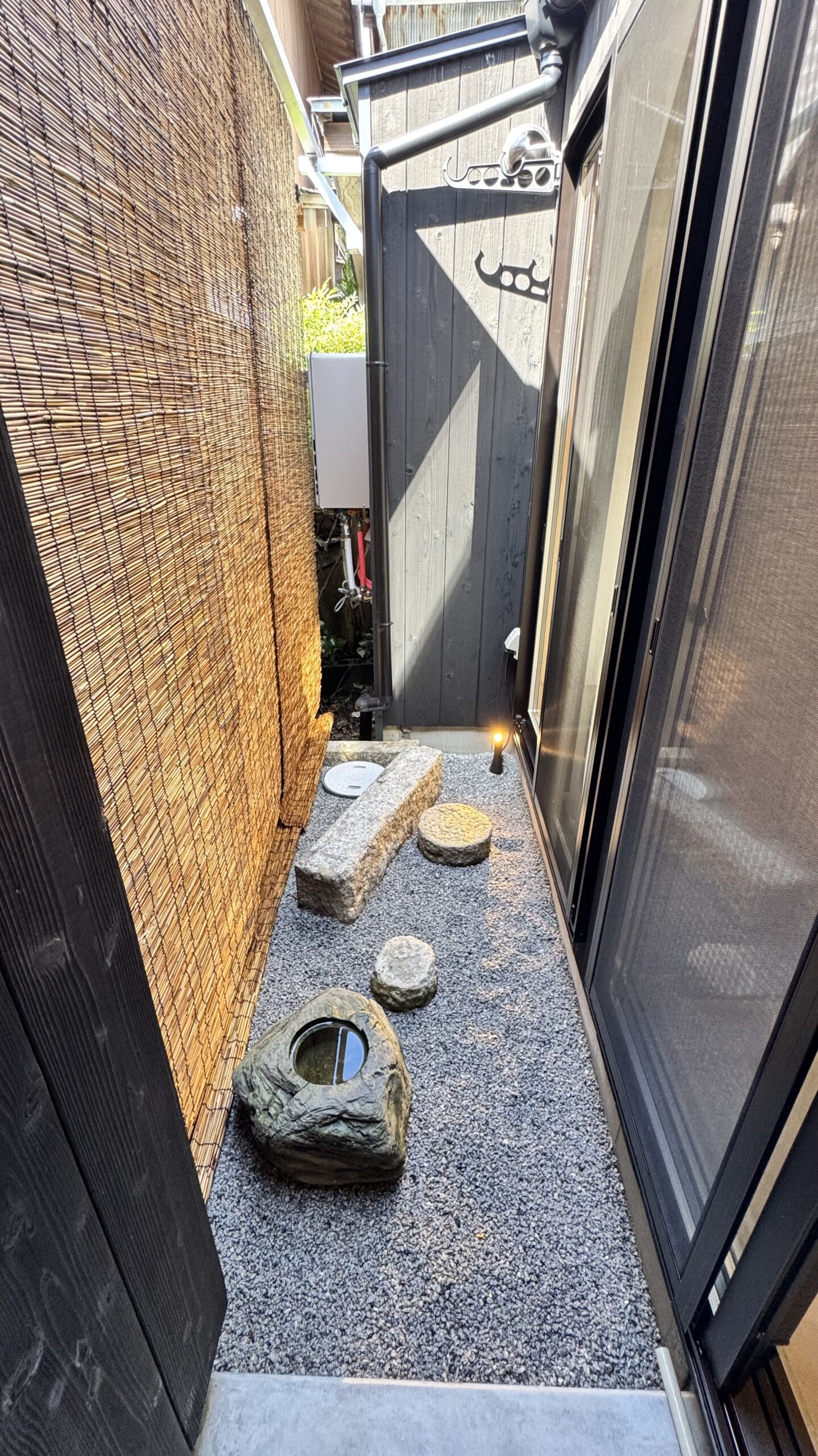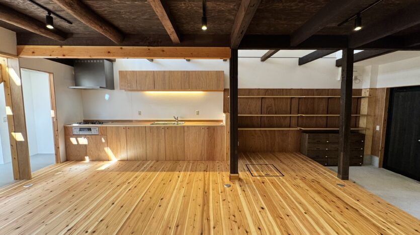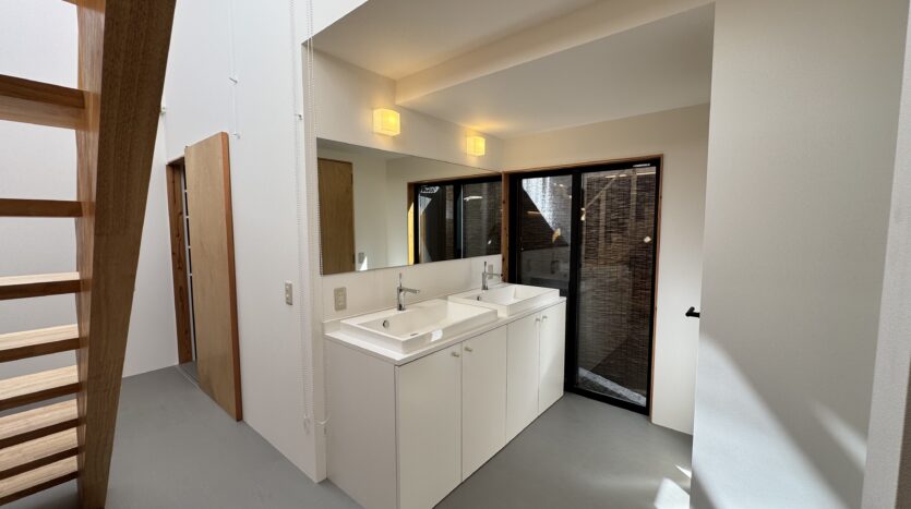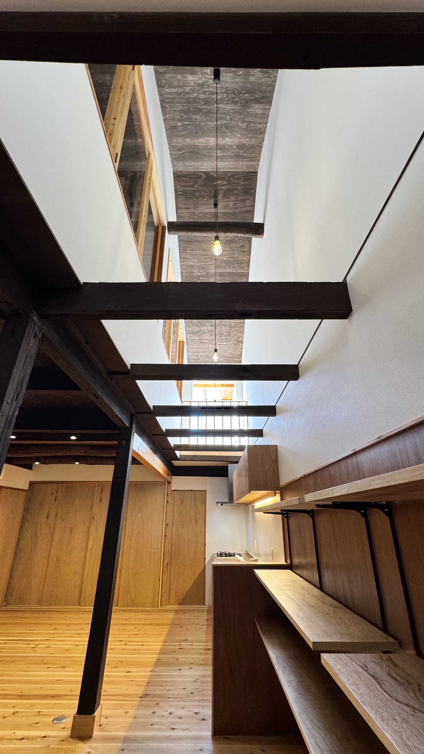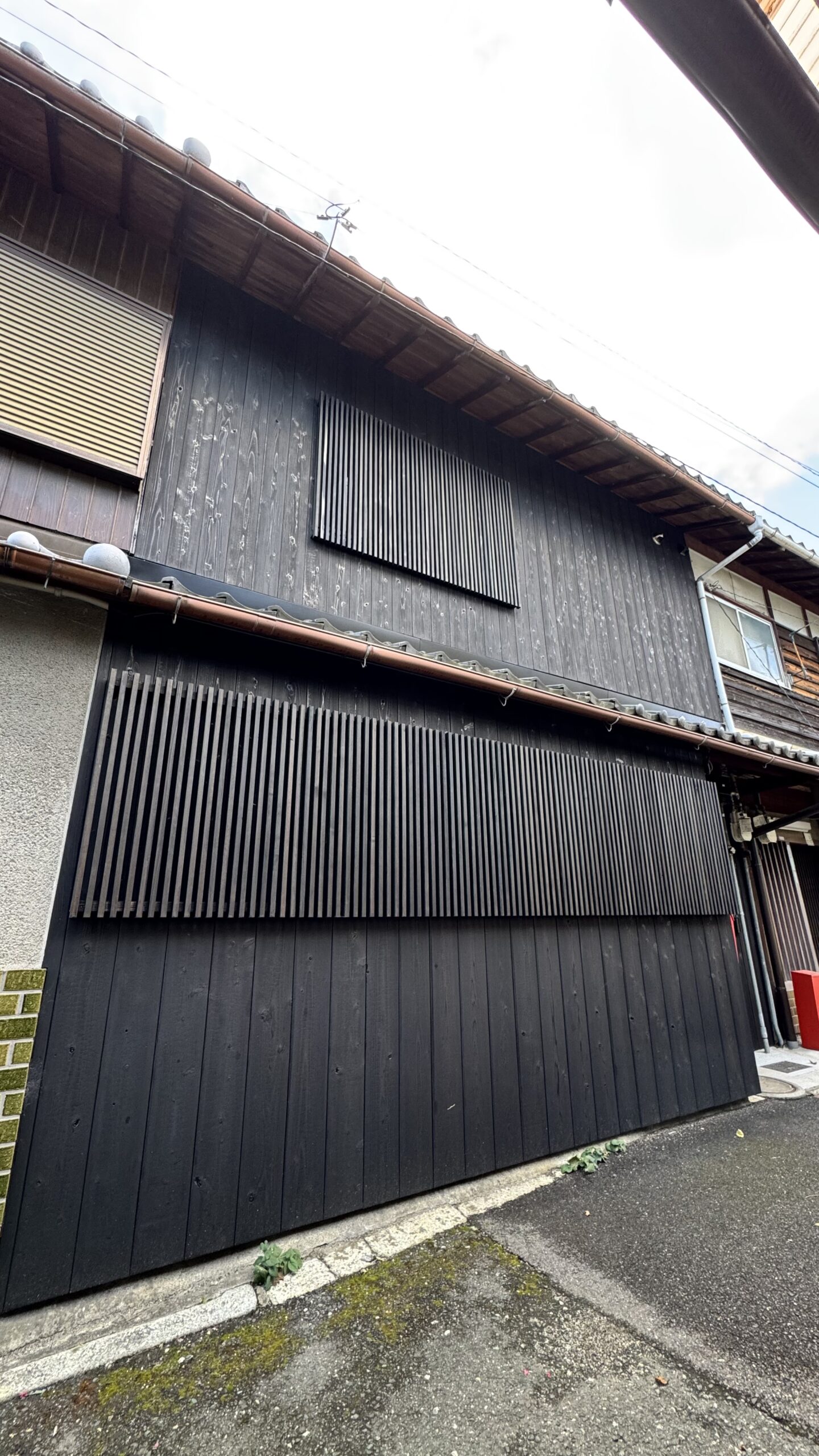This is a machiya house located in Obagawa-cho, Otsu City, Shiga Prefecture. The building is a two-story row house, with renovations completed in September 2025. The roof tiles have been inspected for leaks, and termite inspection has been completed. Both sides of the walls and the roof are insulated, and the floors have been newly poured concrete. The water supply, sewerage, electrical wiring, and gas piping have all been newly installed. The first floor features a brand-new custom kitchen with a wide countertop that’s a must-see. There are toilets on both the first and second floors, and the first-floor washbasin has the rare feature of two sinks. The bathtub is also new and offers a view of the garden. Air conditioners are installed in each room on the second floor, and a large unit is installed in the living-dining area on the first floor. The most notable features are the second-floor double-height ceiling and the first-floor earthen floor design. The earthen floor features movable shelving, perfect for hobbies. You can park your motorcycle here upon returning home, or use it as a play area for small children. The townhouse-style double-height ceiling creates an unexpectedly spacious feel for a row house.