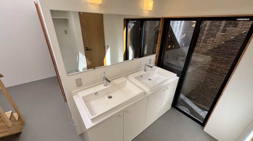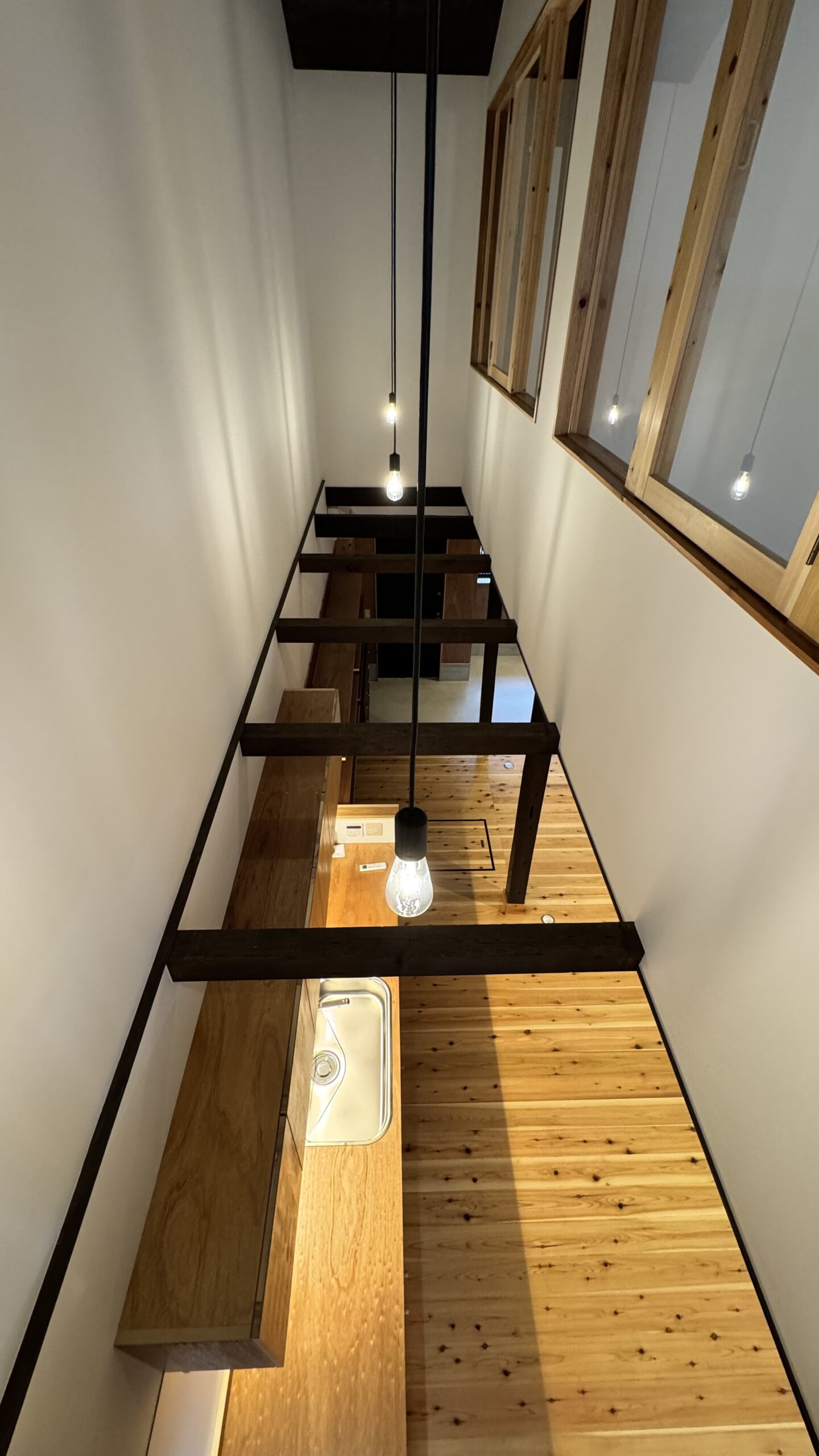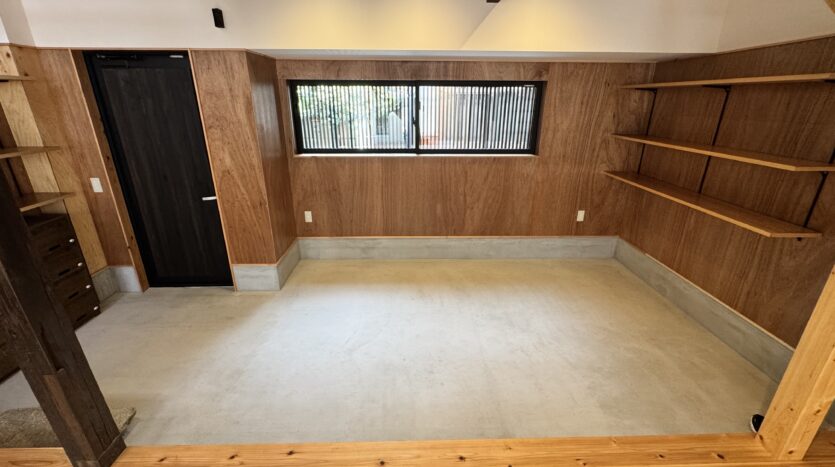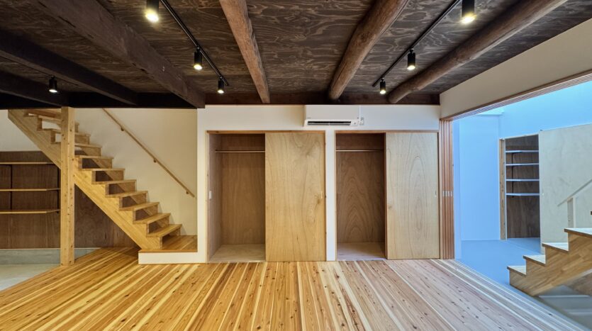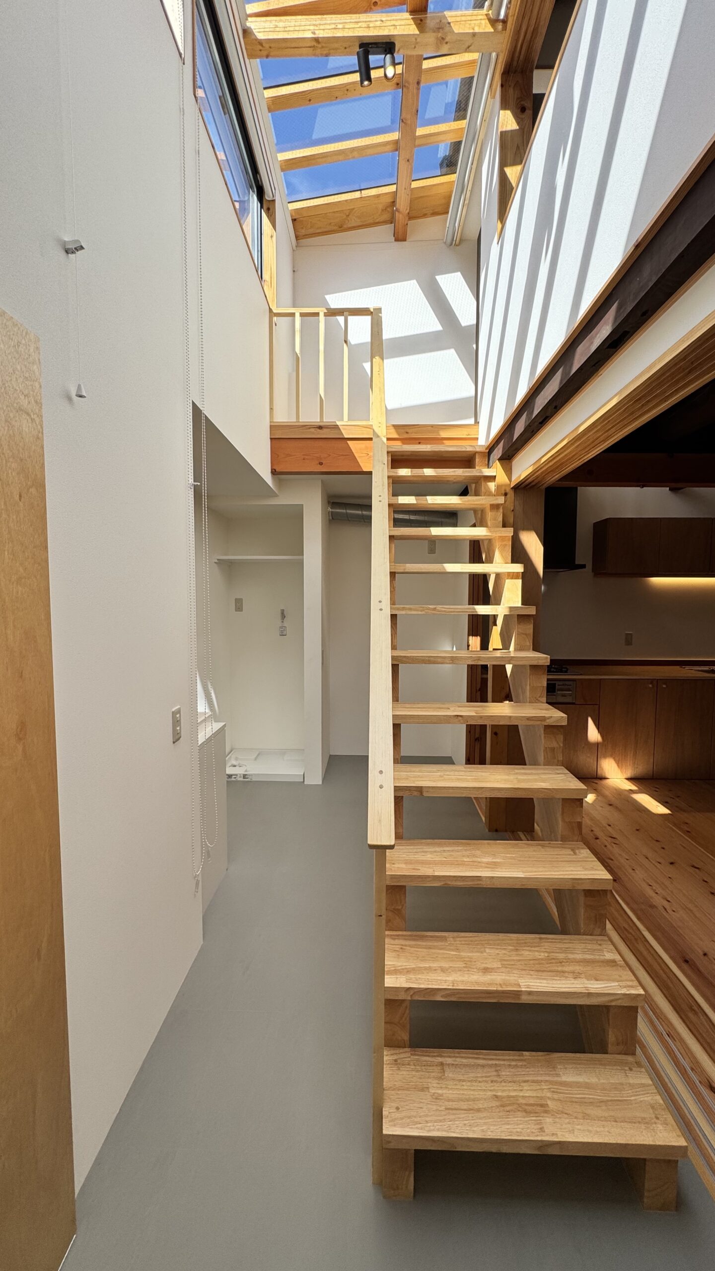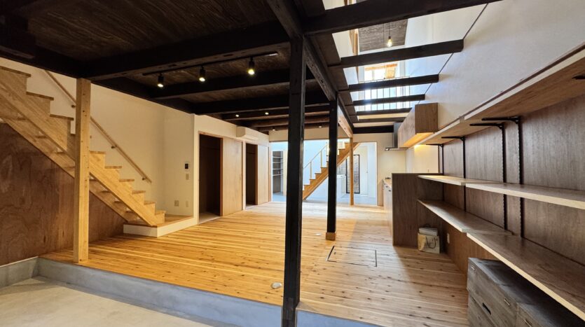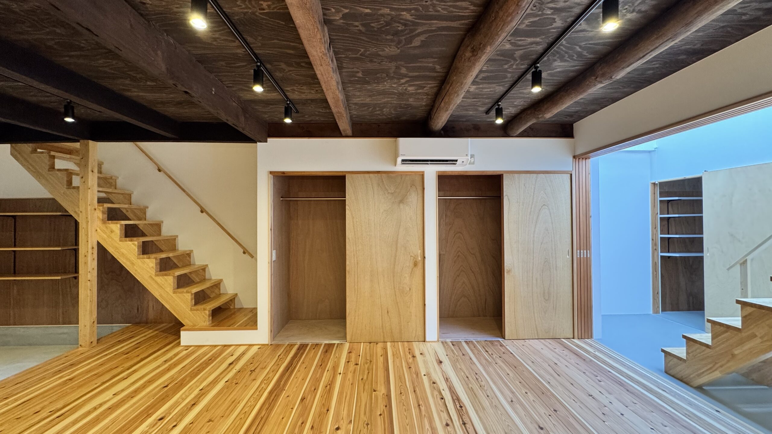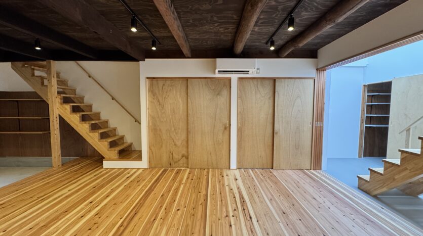 This is a machiya house located in Obagawa-cho, Otsu City, Shiga Prefecture. The building is a two-story row house, with renovations completed in September 2025. The roof tiles have been inspected for leaks, and termite inspection has been completed. Both sides of the walls and the roof are insulated, and the floors have been newly poured concrete. The water supply, sewerage, electrical wiring, and gas piping have all been newly installed. The first floor features a brand-new custom kitchen with a wide countertop that’s a must-see. There are toilets on both the first and second floors, and the first-floor washbasin has the rare feature of two sinks. The bathtub is also new and offers a view of the garden. Air conditioners are installed in each room on the second floor, and a large unit is installed in the living-dining area on the first floor. The most notable features are the second-floor double-height ceiling and the first-floor earthen floor design. The earthen floor features movable shelving, perfect for hobbies. You can park your motorcycle here upon returning home, or use it as a play area for small children. The townhouse-style double-height ceiling creates an unexpectedly spacious feel for a row house.
