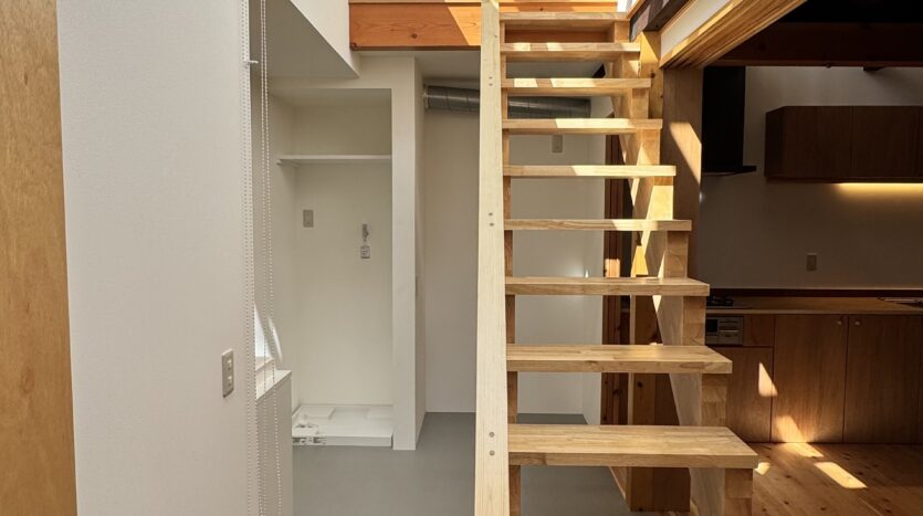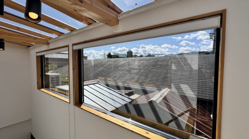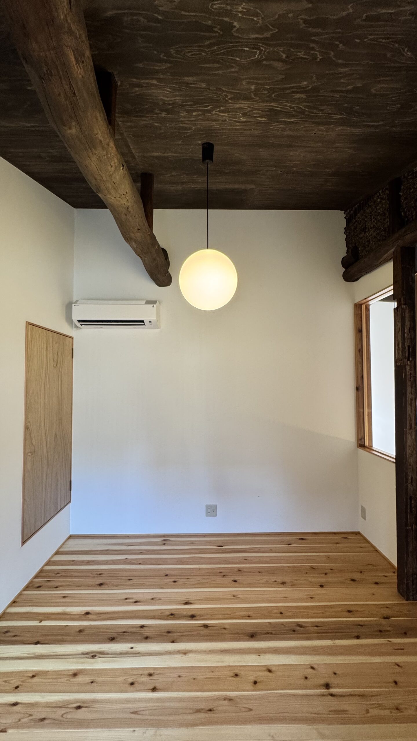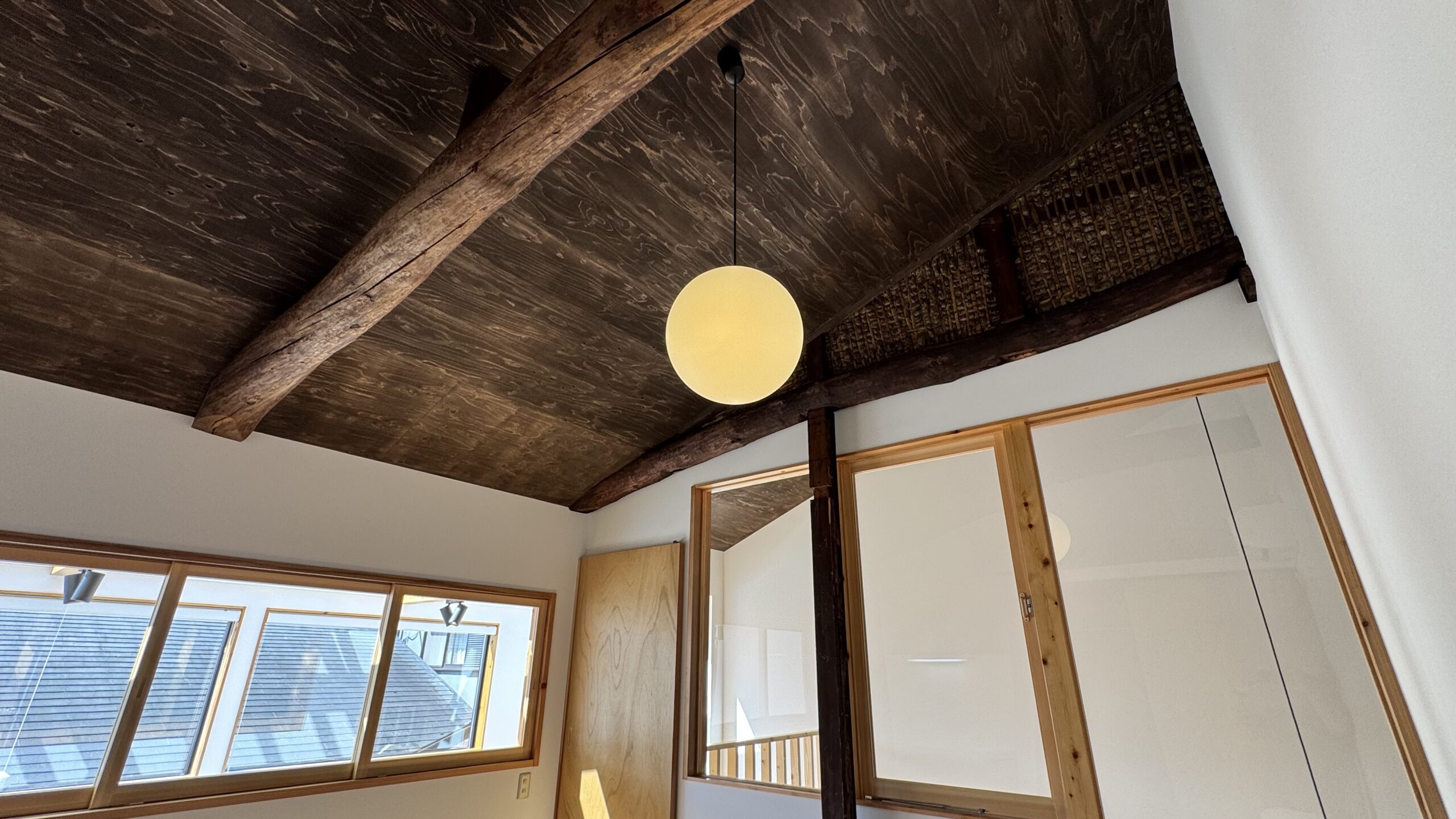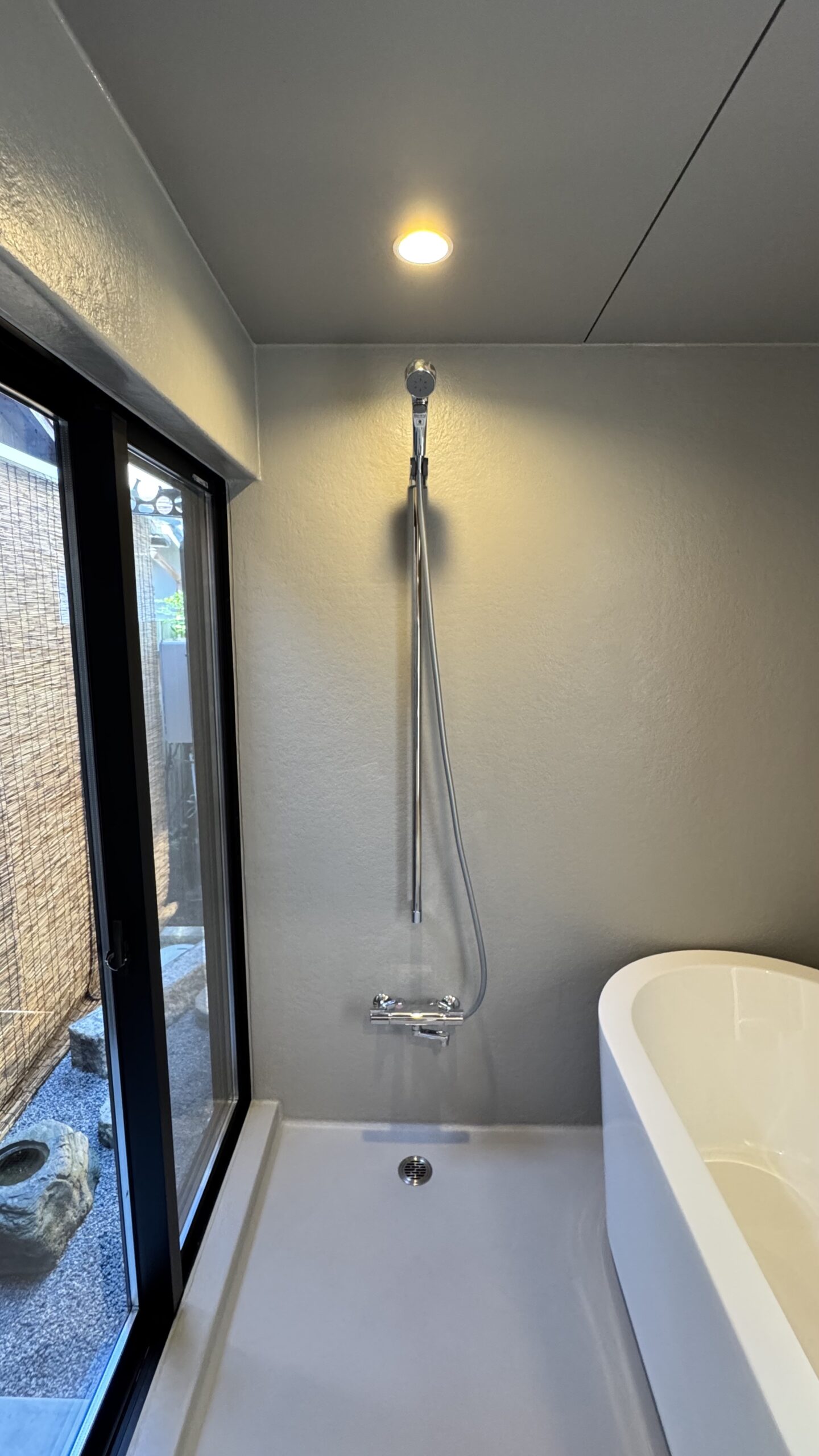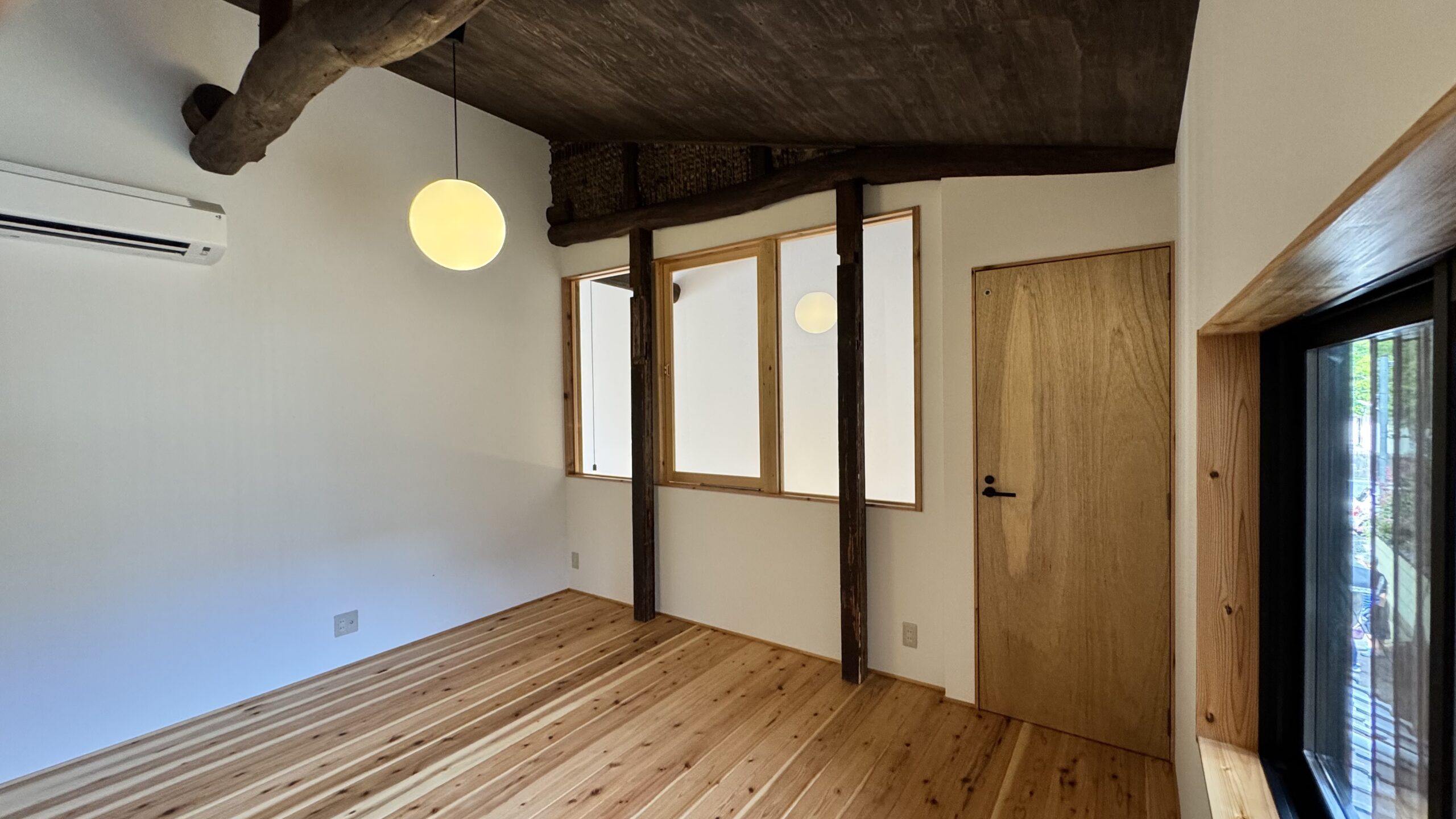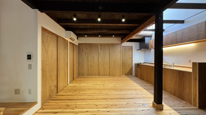 This is a machiya house located in Obagawa-cho, Otsu City, Shiga Prefecture. The building is a two-story row house, with renovations completed in September 2025. The roof tiles have been inspected for leaks, and termite inspection has been completed. Both sides of the walls and the roof are insulated, and the floors have been newly poured concrete. The water supply, sewerage, electrical wiring, and gas piping have all been newly installed. The first floor features a brand-new custom kitchen with a wide countertop that’s a must-see. There are toilets on both the first and second floors, and the first-floor washbasin has the rare feature of two sinks. The bathtub is also new and offers a view of the garden. Air conditioners are installed in each room on the second floor, and a large unit is installed in the living-dining area on the first floor. The most notable features are the second-floor double-height ceiling and the first-floor earthen floor design. The earthen floor features movable shelving, perfect for hobbies. You can park your motorcycle here upon returning home, or use it as a play area for small children. The townhouse-style double-height ceiling creates an unexpectedly spacious feel for a row house.