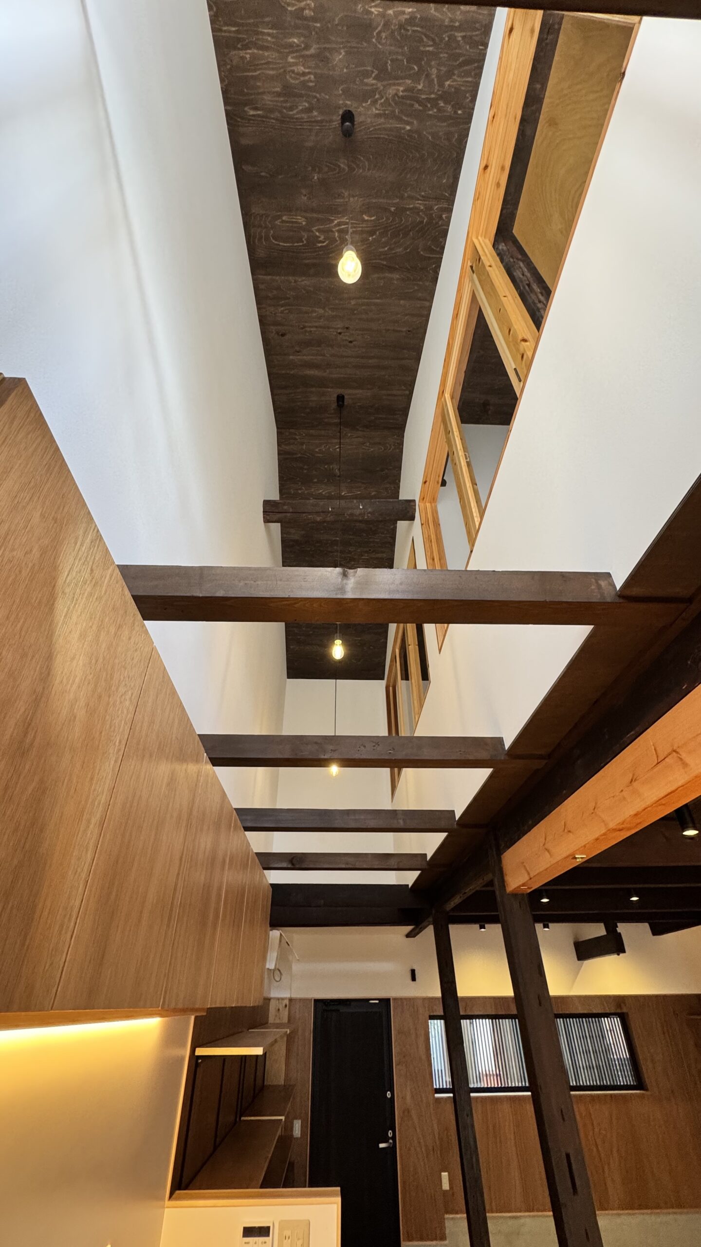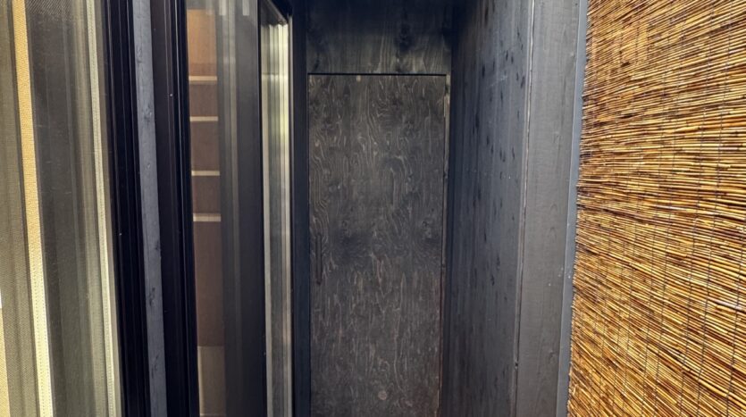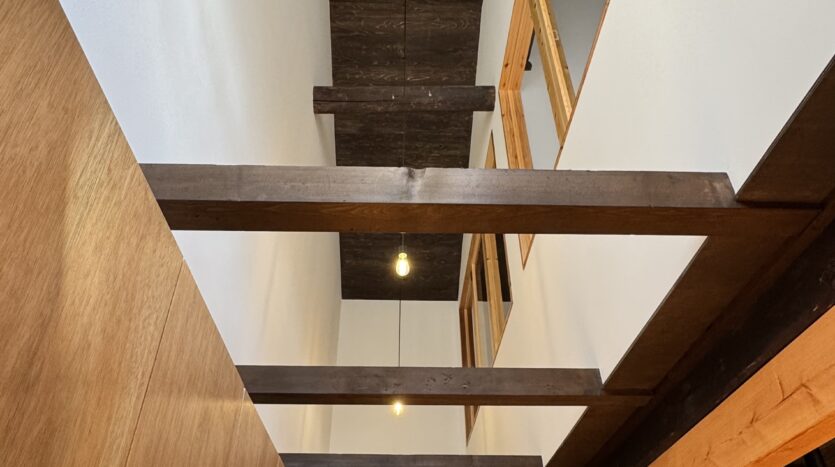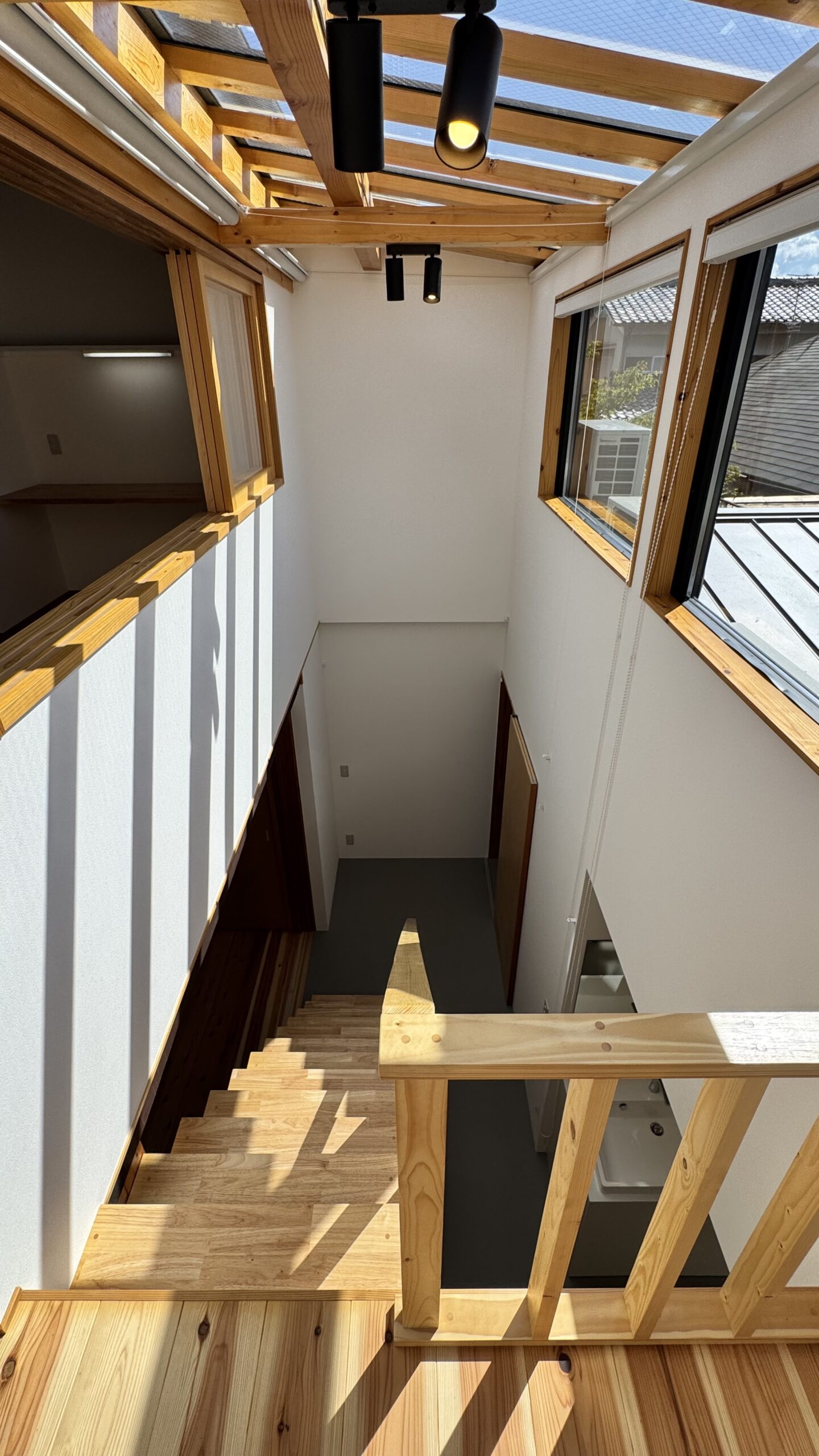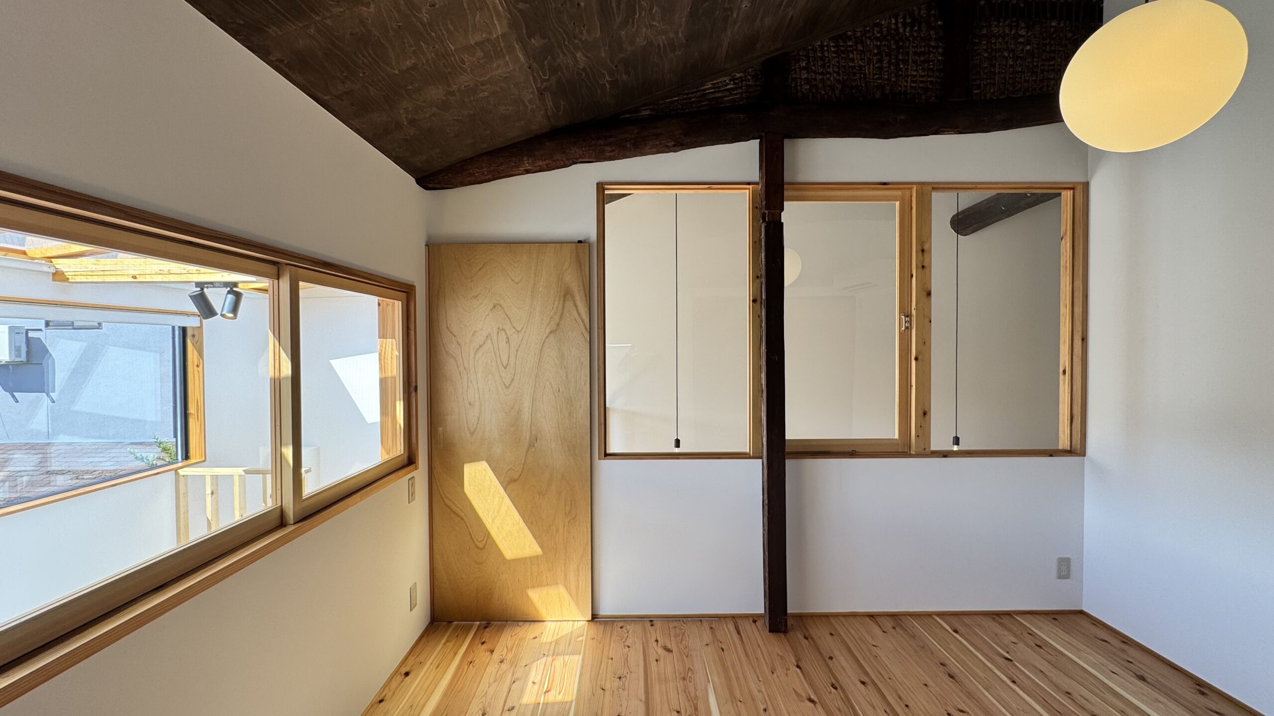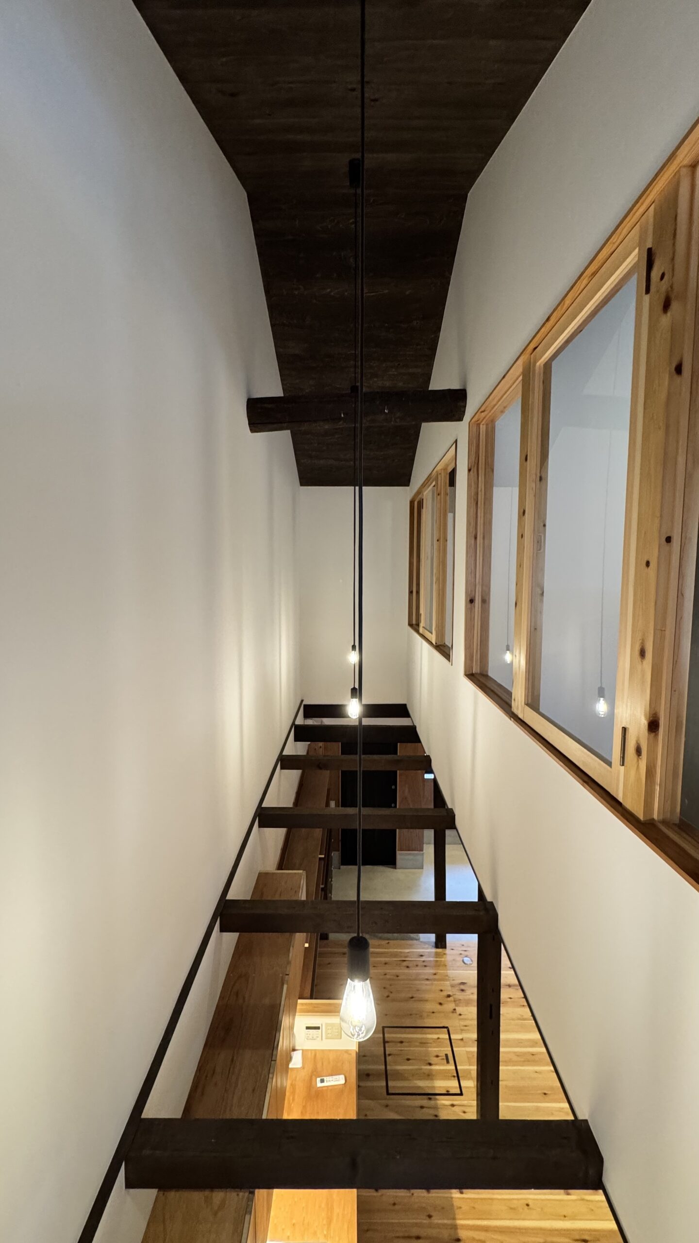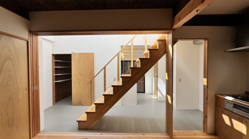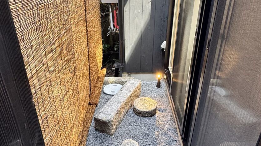 This is a machiya house located in Obagawa-cho, Otsu City, Shiga Prefecture. The building is a two-story row house, with renovations completed in September 2025. The roof tiles have been inspected for leaks, and termite inspection has been completed. Both sides of the walls and the roof are insulated, and the floors have been newly poured concrete. The water supply, sewerage, electrical wiring, and gas piping have all been newly installed. The first floor features a brand-new custom kitchen with a wide countertop that’s a must-see. There are toilets on both the first and second floors, and the first-floor washbasin has the rare feature of two sinks. The bathtub is also new and offers a view of the garden. Air conditioners are installed in each room on the second floor, and a large unit is installed in the living-dining area on the first floor. The most notable features are the second-floor double-height ceiling and the first-floor earthen floor design. The earthen floor features movable shelving, perfect for hobbies. You can park your motorcycle here upon returning home, or use it as a play area for small children. The townhouse-style double-height ceiling creates an unexpectedly spacious feel for a row house.