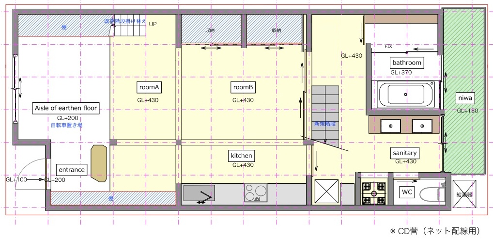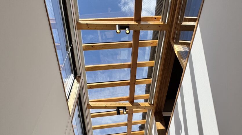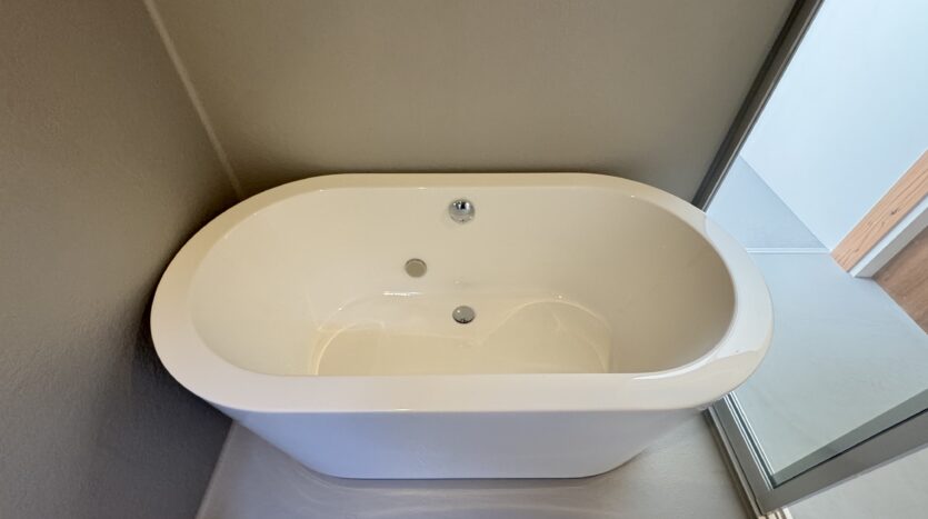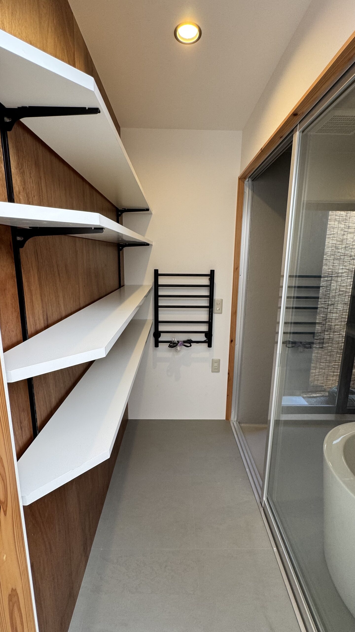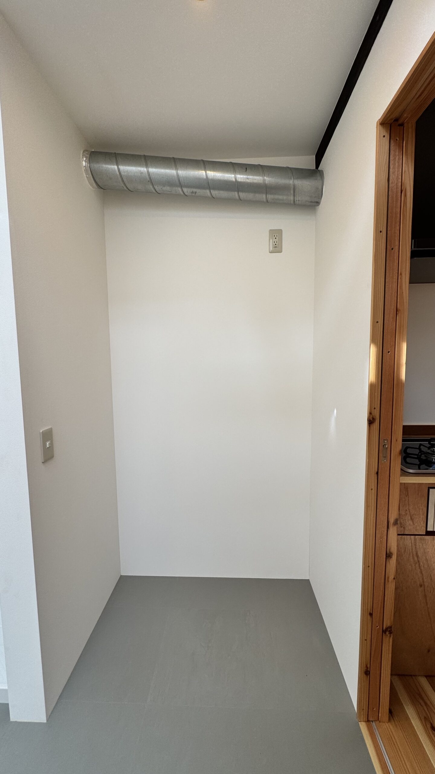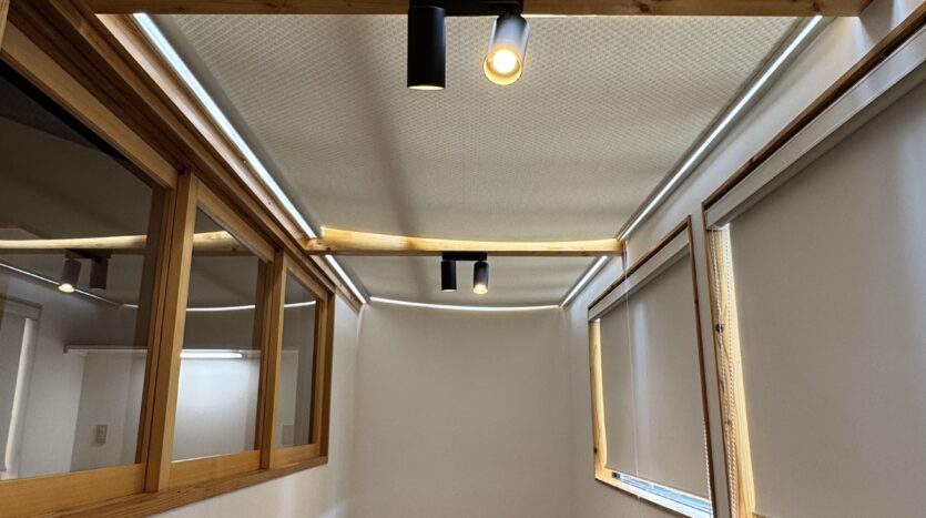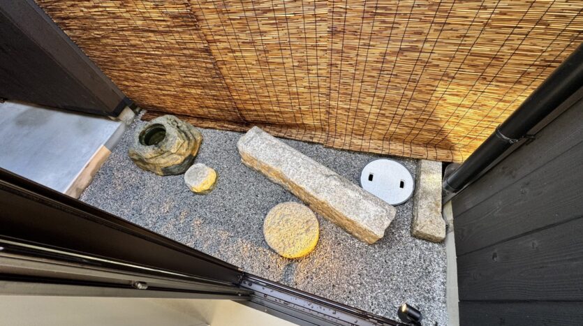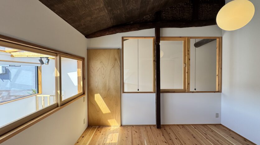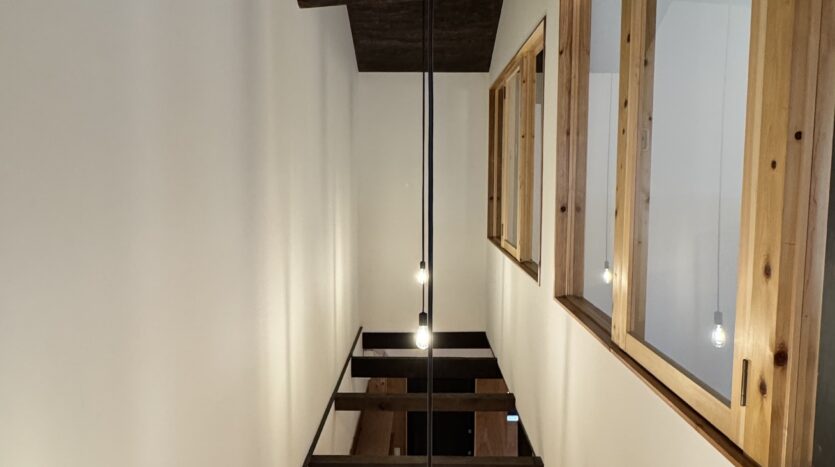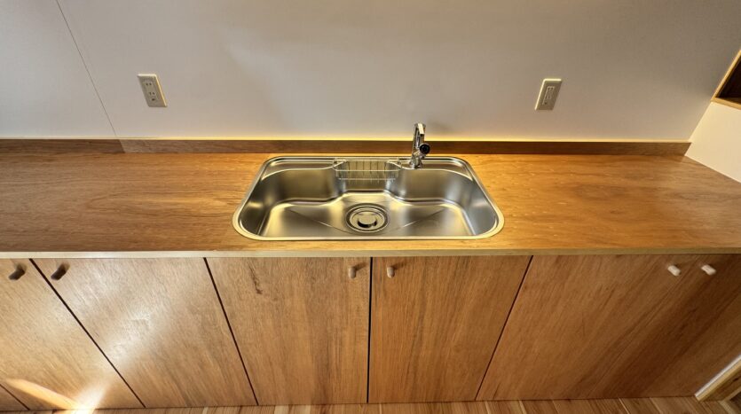 This is a machiya house located in Obagawa-cho, Otsu City, Shiga Prefecture. The building is a two-story row house, with renovations completed in September 2025. The roof tiles have been inspected for leaks, and termite inspection has been completed. Both sides of the walls and the roof are insulated, and the floors have been newly poured concrete. The water supply, sewerage, electrical wiring, and gas piping have all been newly installed. The first floor features a brand-new custom kitchen with a wide countertop that’s a must-see. There are toilets on both the first and second floors, and the first-floor washbasin has the rare feature of two sinks. The bathtub is also new and offers a view of the garden. Air conditioners are installed in each room on the second floor, and a large unit is installed in the living-dining area on the first floor. The most notable features are the second-floor double-height ceiling and the first-floor earthen floor design. The earthen floor features movable shelving, perfect for hobbies. You can park your motorcycle here upon returning home, or use it as a play area for small children. The townhouse-style double-height ceiling creates an unexpectedly spacious feel for a row house.