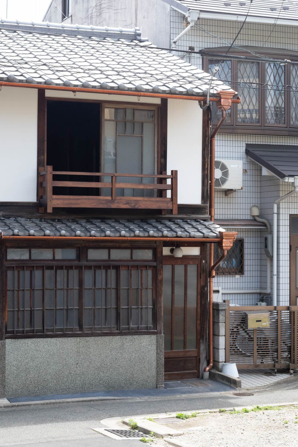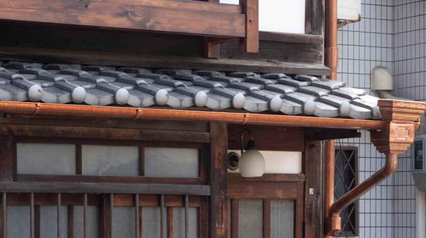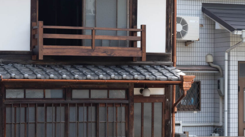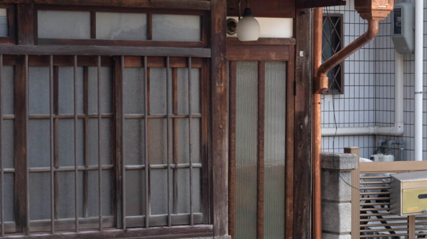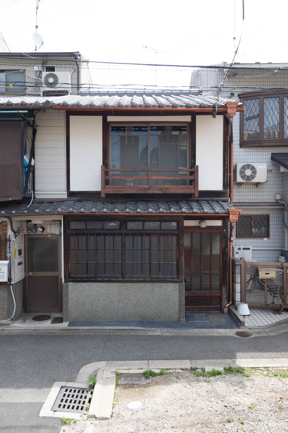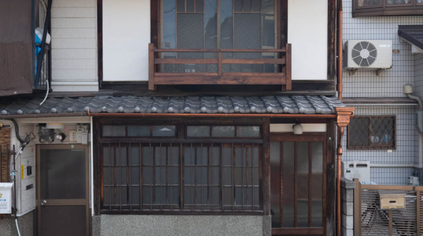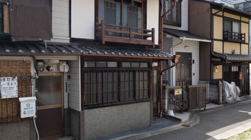 The house features a classic Machiya exterior—lattice windows, earthen walls, retro-style second-floor windows, and copper gutters—adding charm to the streetscape.