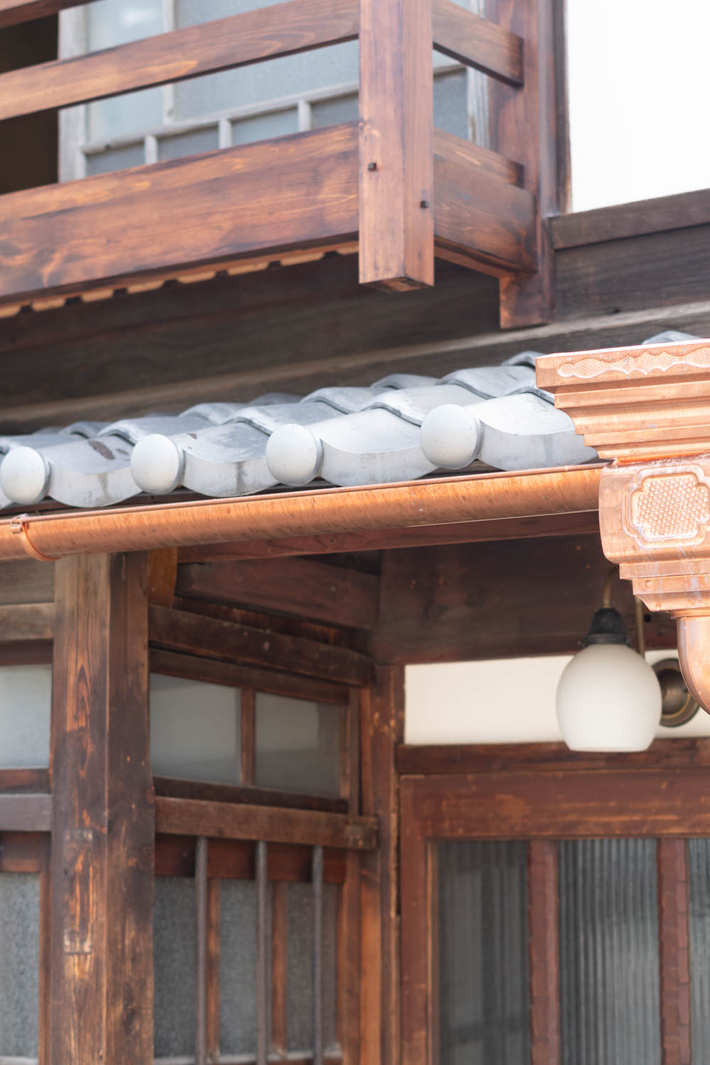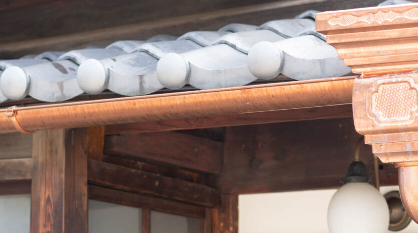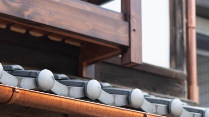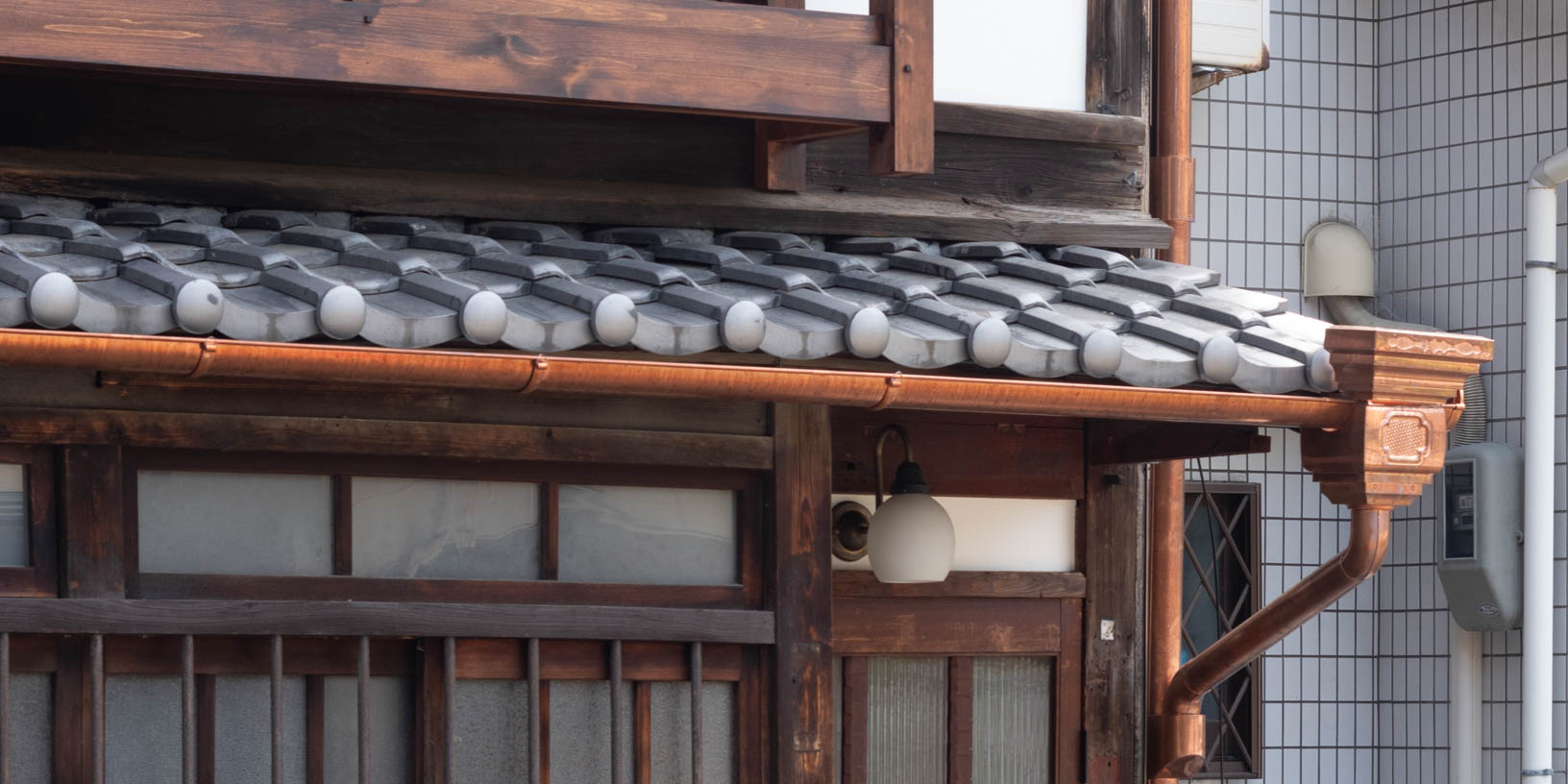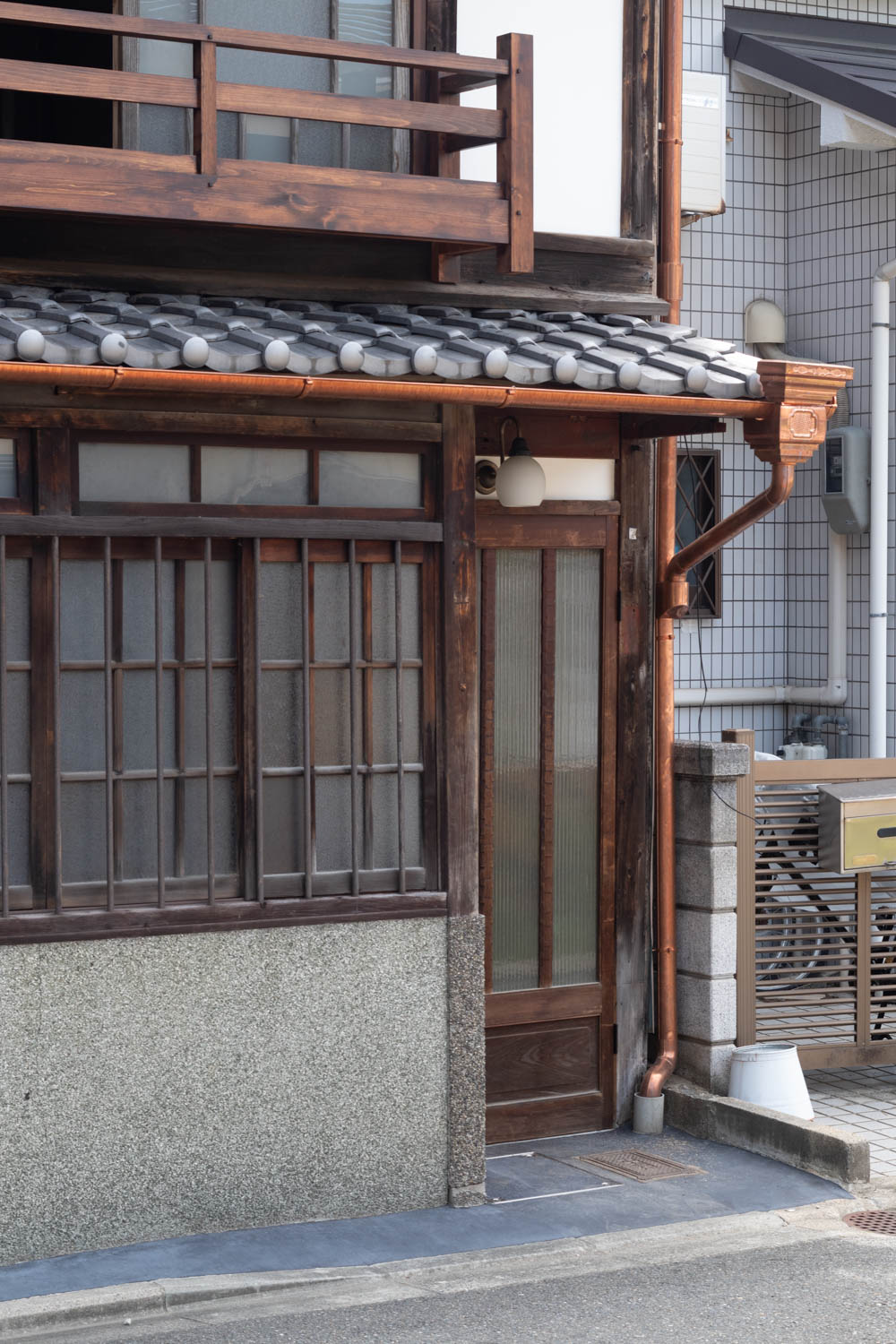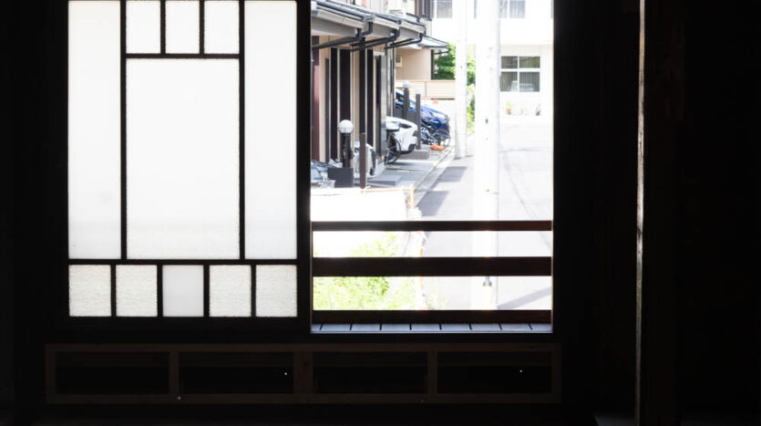 The house features a classic Machiya exterior—lattice windows, earthen walls, retro-style second-floor windows, and copper gutters—adding charm to the streetscape.