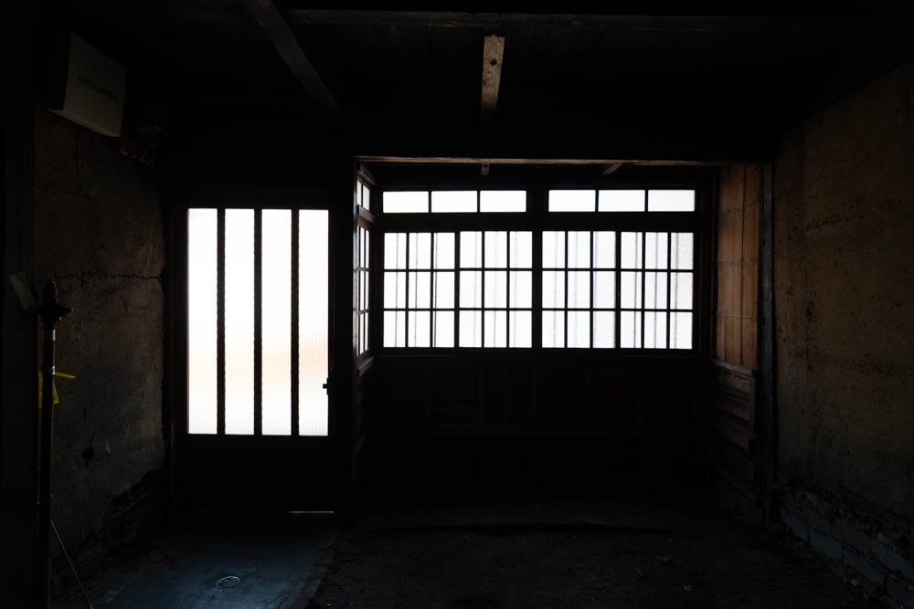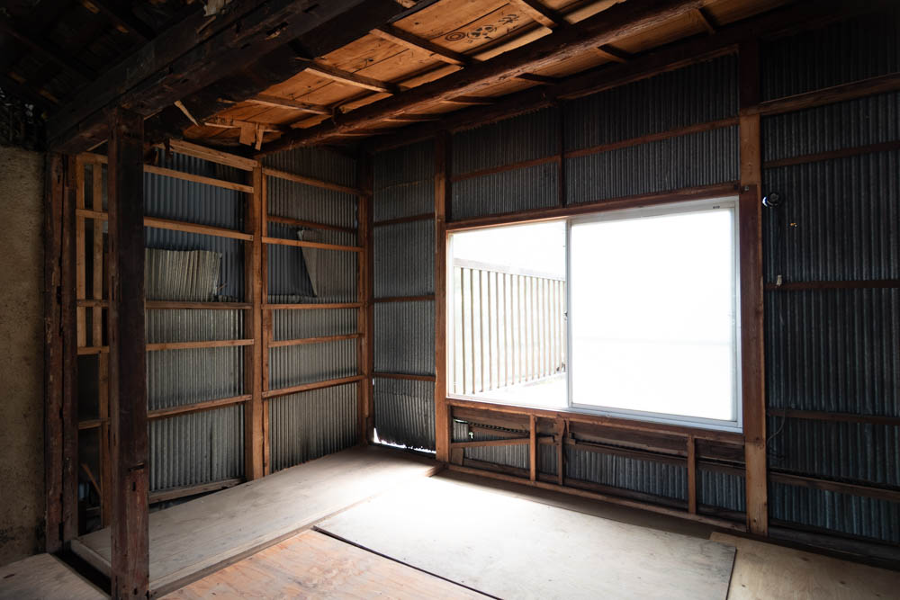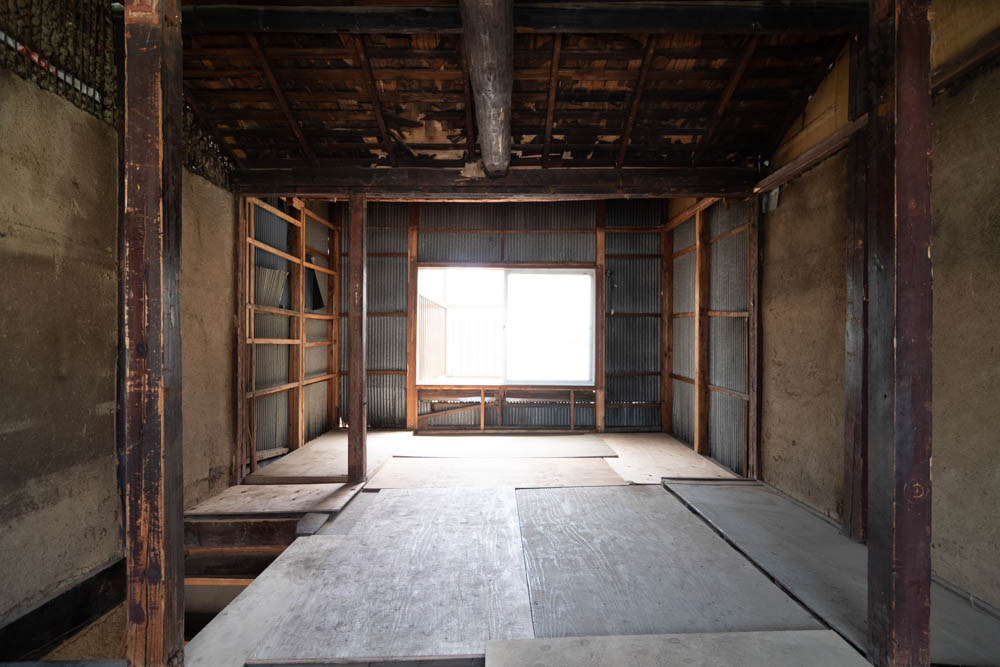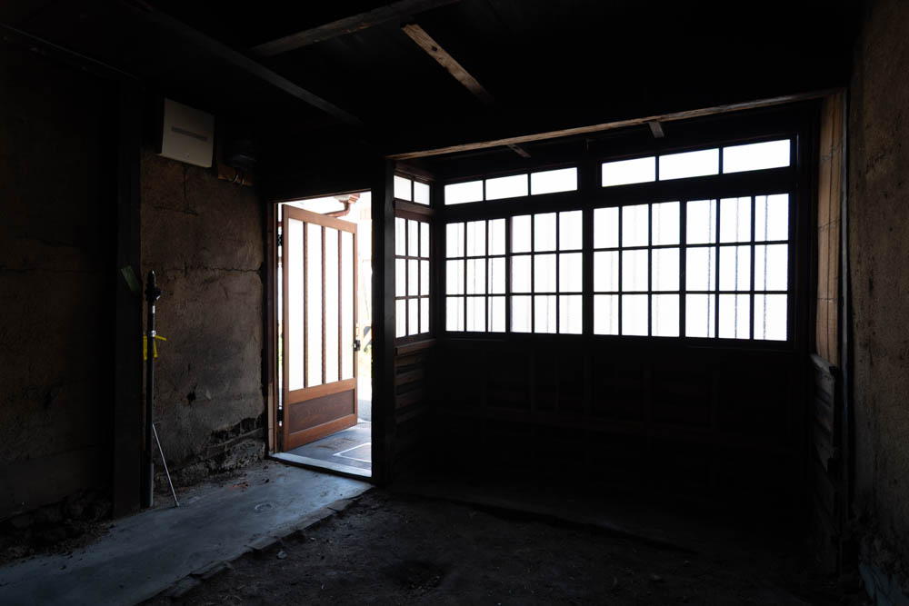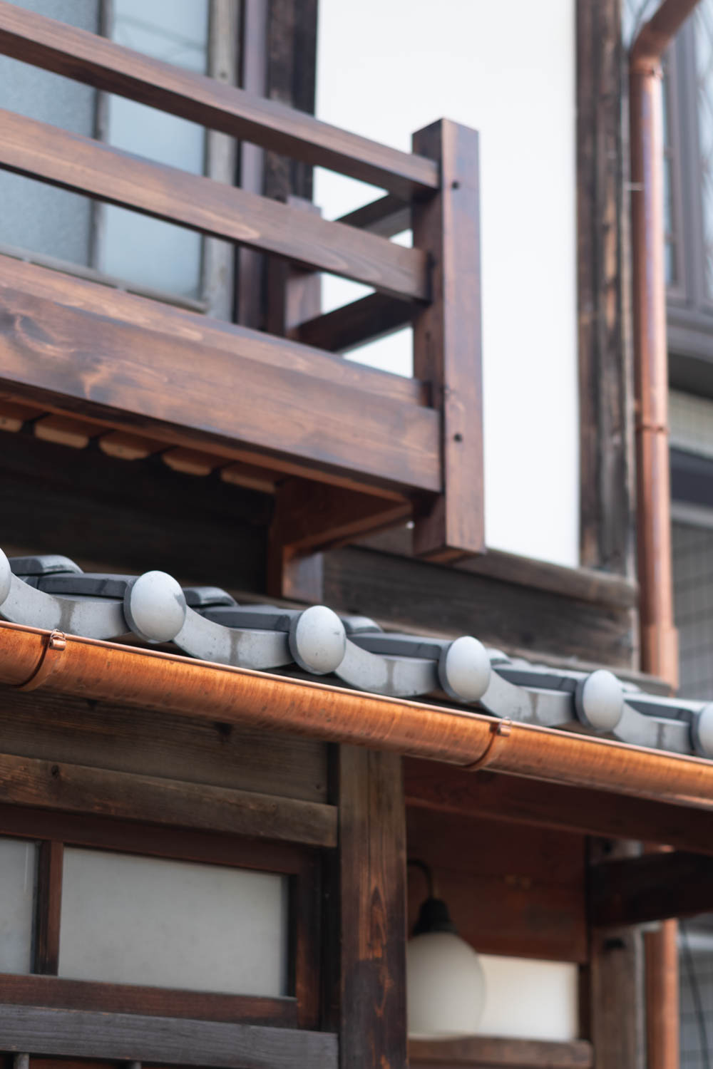 The house features a classic Machiya exterior—lattice windows, earthen walls, retro-style second-floor windows, and copper gutters—adding charm to the streetscape.