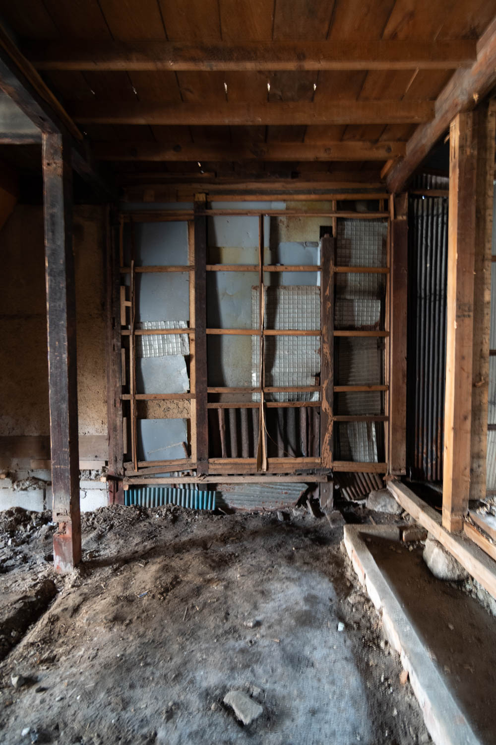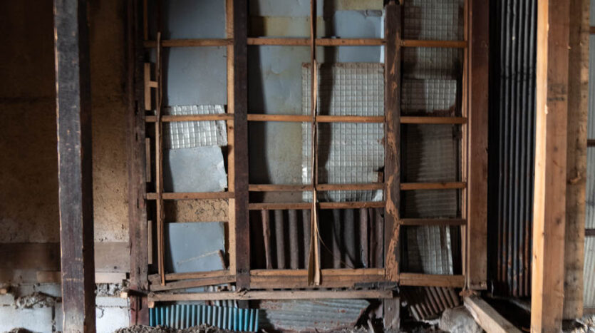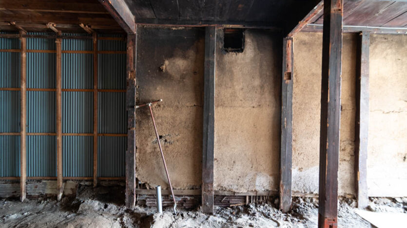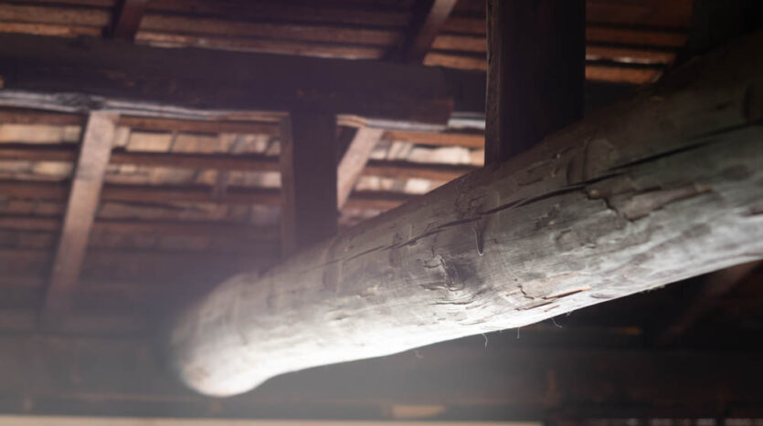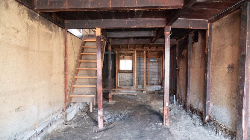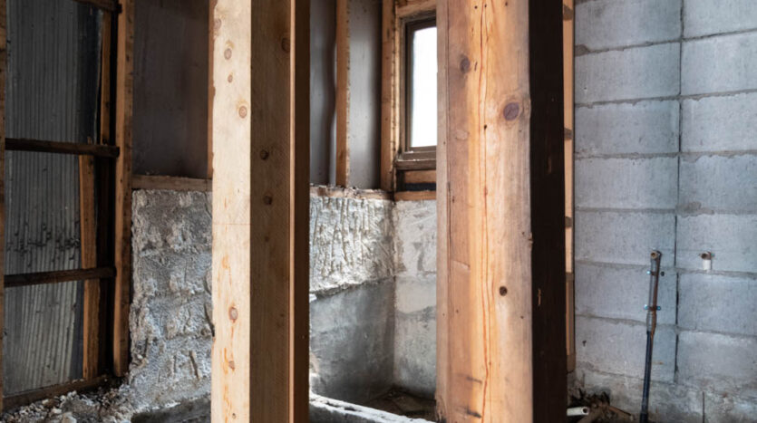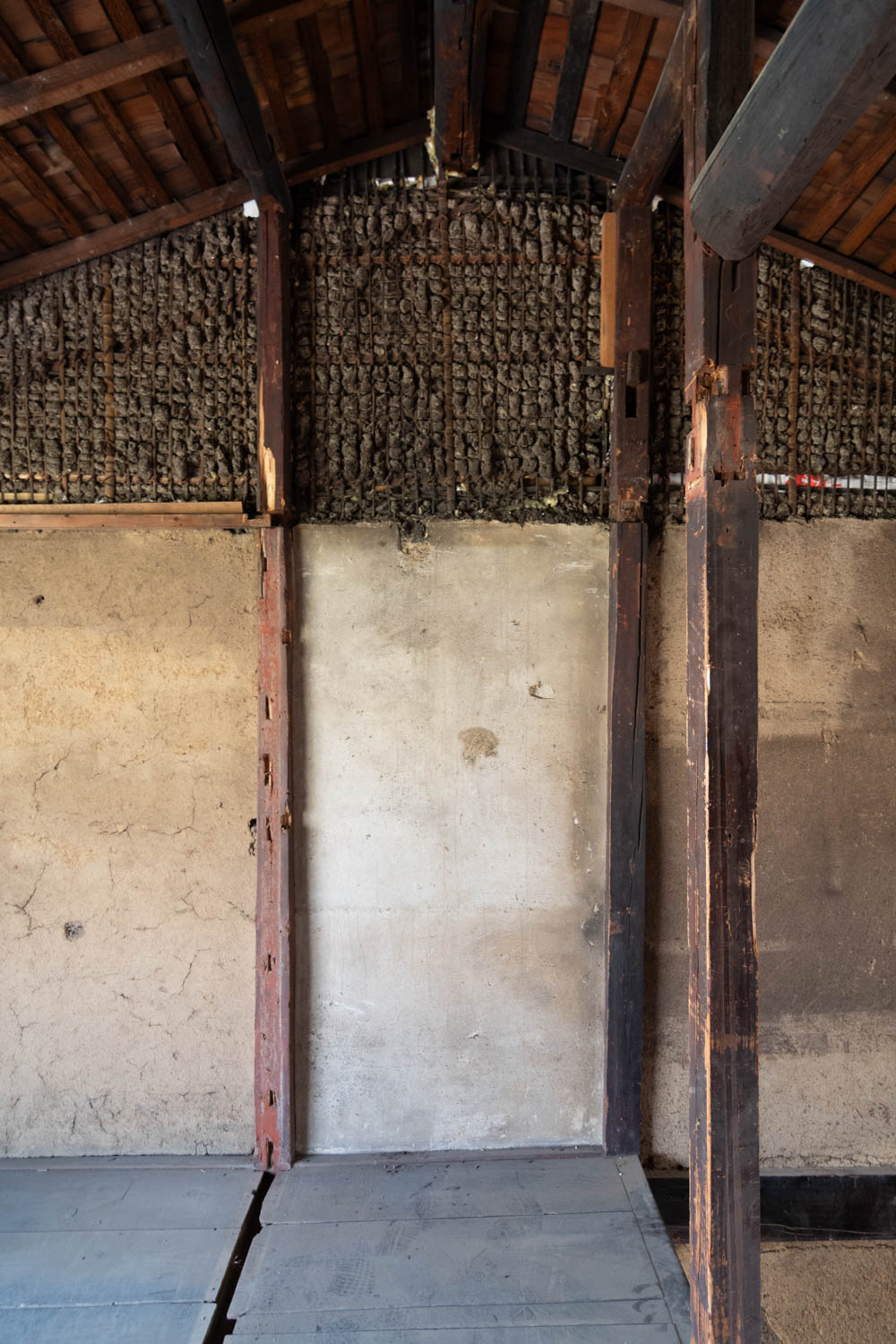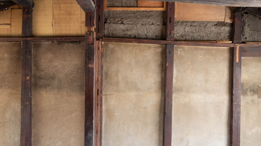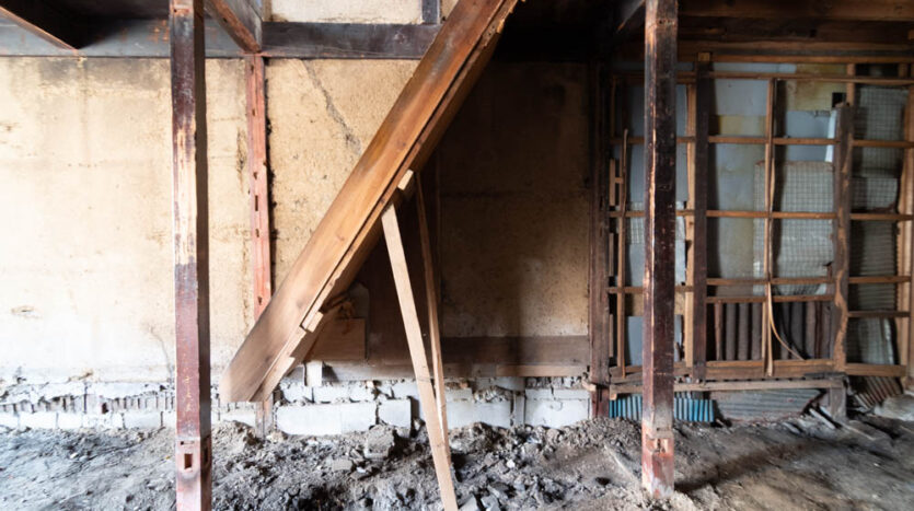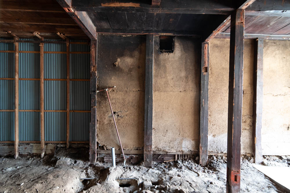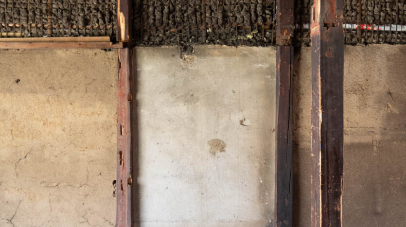 Inside, it has been fully stripped back, ready for a new owner to renovate and bring their vision to life. Original elements like earthen walls and wooden beams remain, telling the story of its long history.