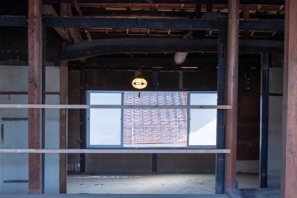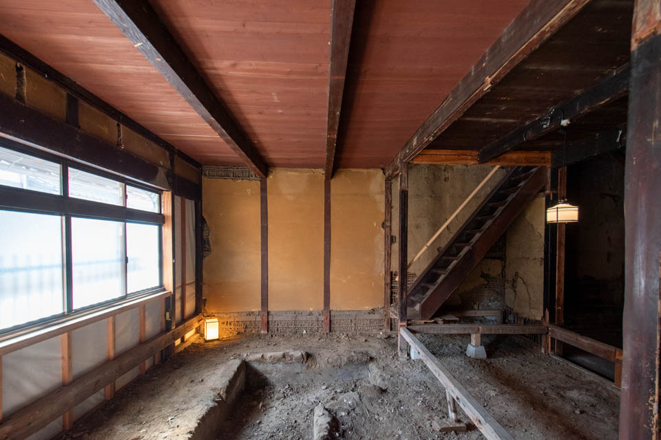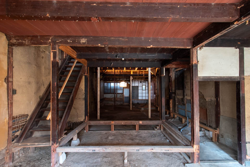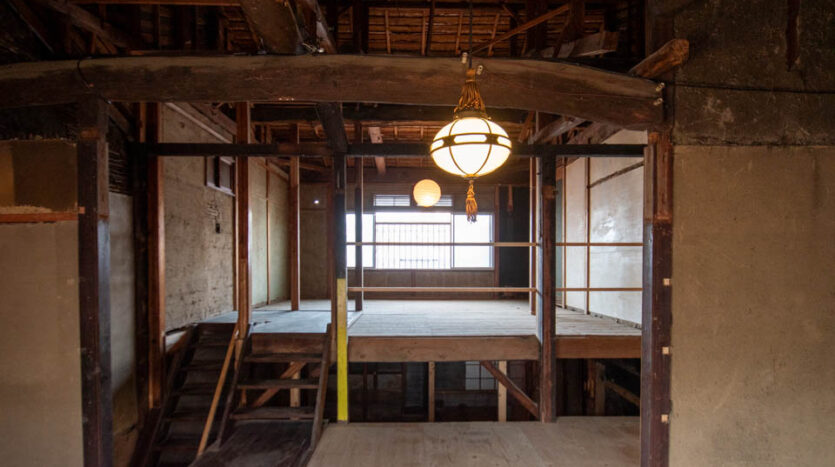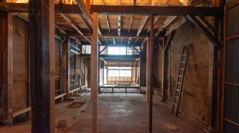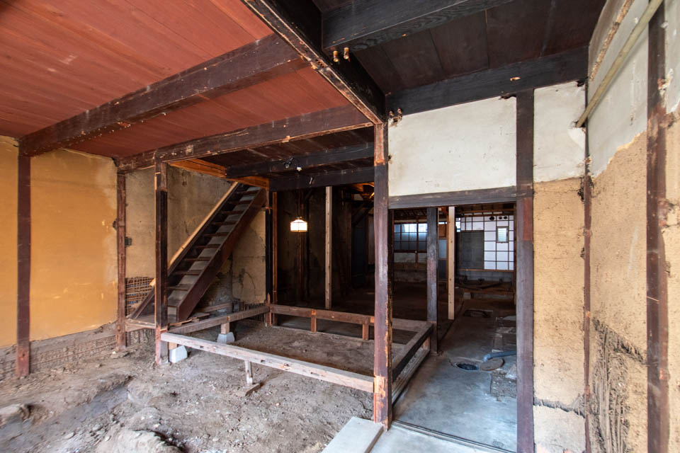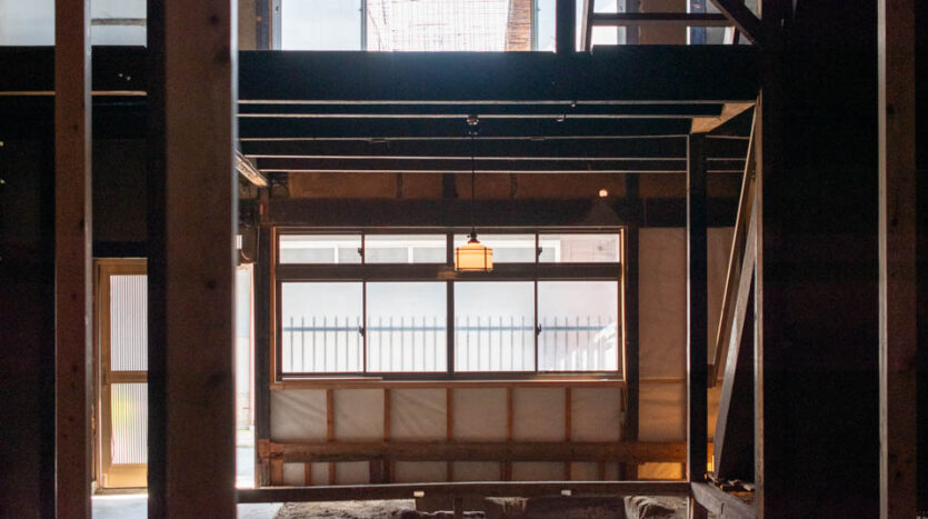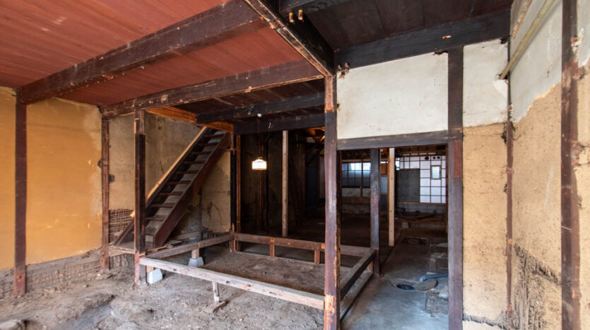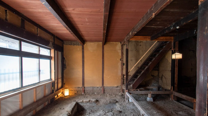 The exterior has been repaired to restore the classic machiya appearance, including the traditional mushiko-mado (insect-cage style lattice window). Inside, the structure is currently in skeleton condition, allowing buyers to design a custom renovation while preserving the nostalgic atmosphere.