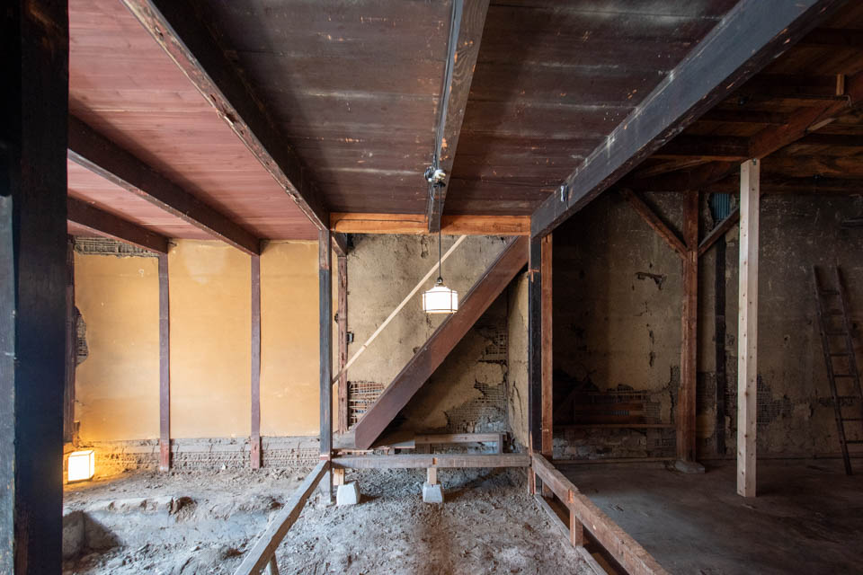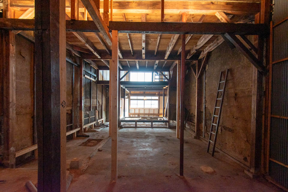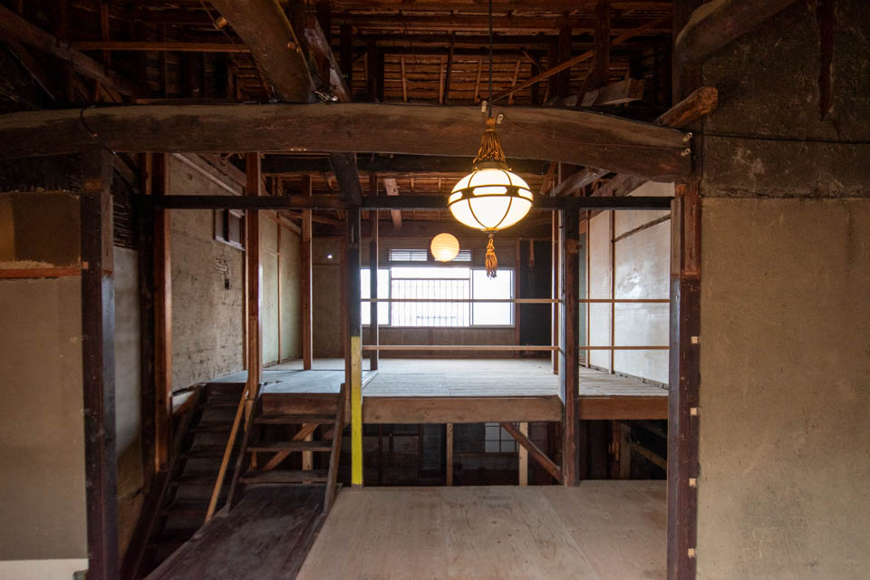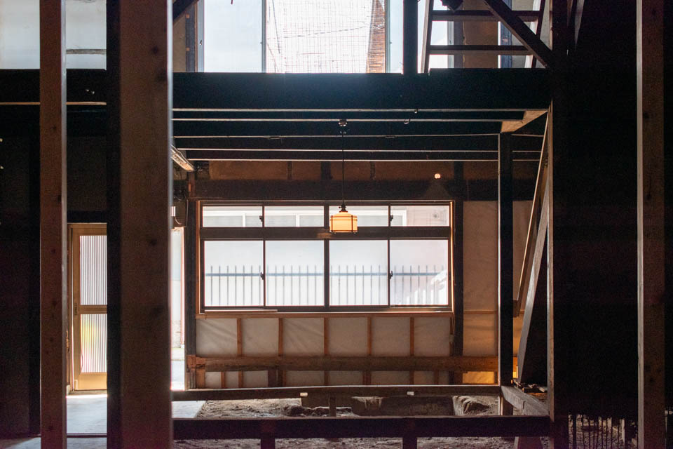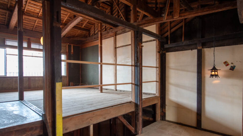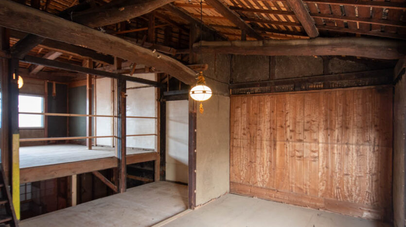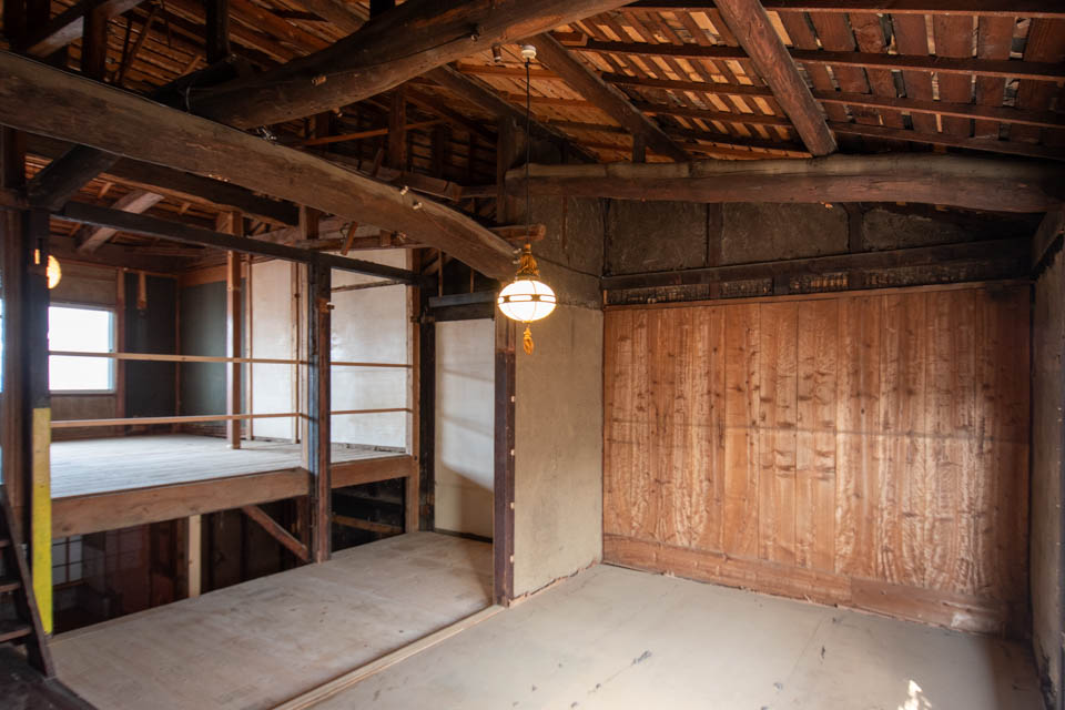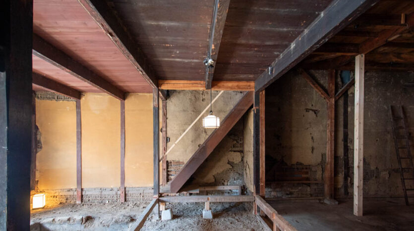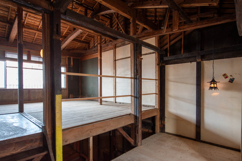 The exterior has been repaired to restore the classic machiya appearance, including the traditional mushiko-mado (insect-cage style lattice window). Inside, the structure is currently in skeleton condition, allowing buyers to design a custom renovation while preserving the nostalgic atmosphere.